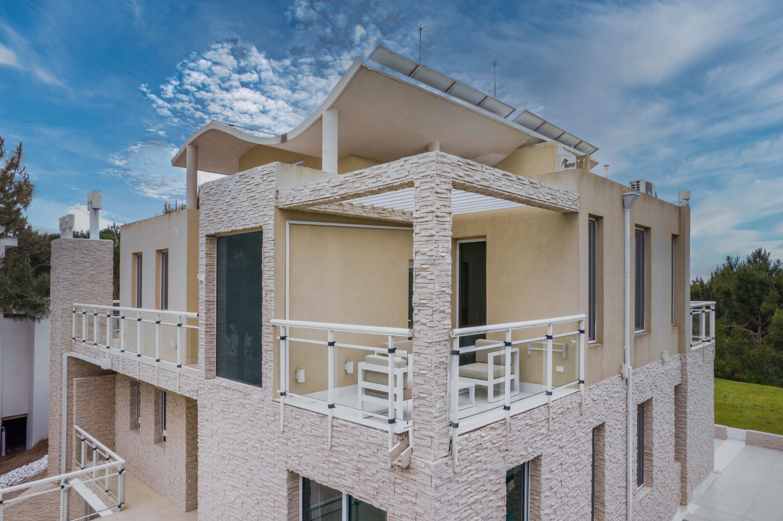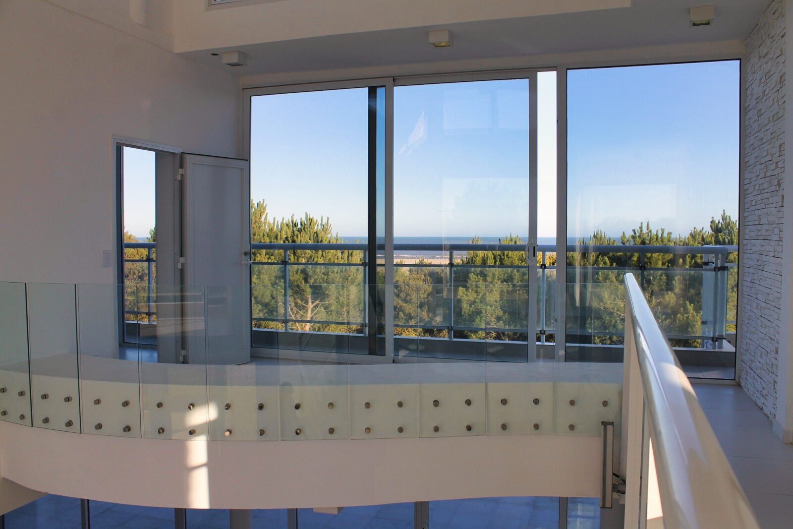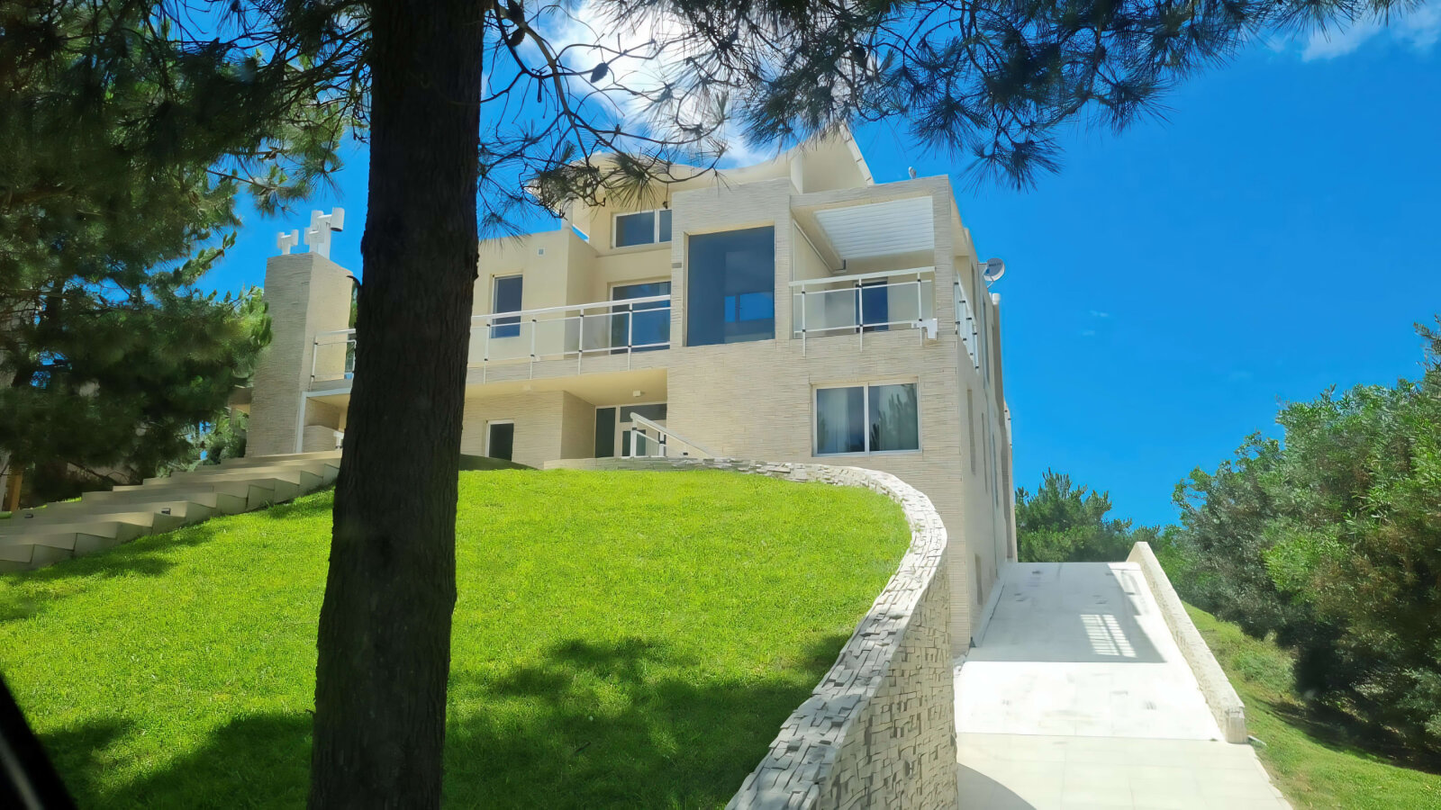 La propiedad se desarrolla en tres niveles con grandes ventanales que integran luz natural y vistas al mar y al bosque. La combinación de piedra, líneas modernas y materiales nobles refuerzan la solidez y elegancia de la construcción.