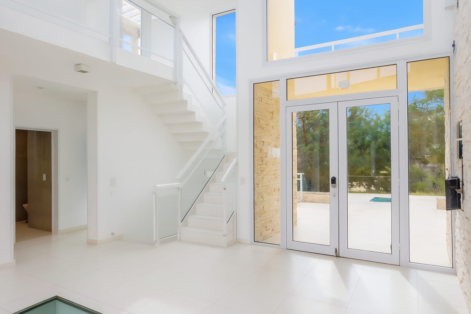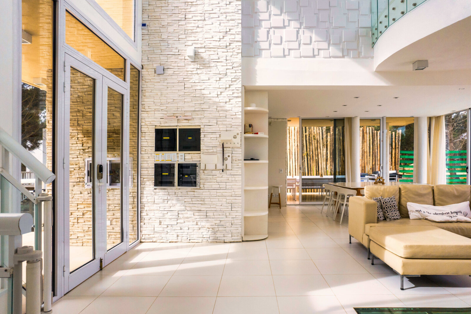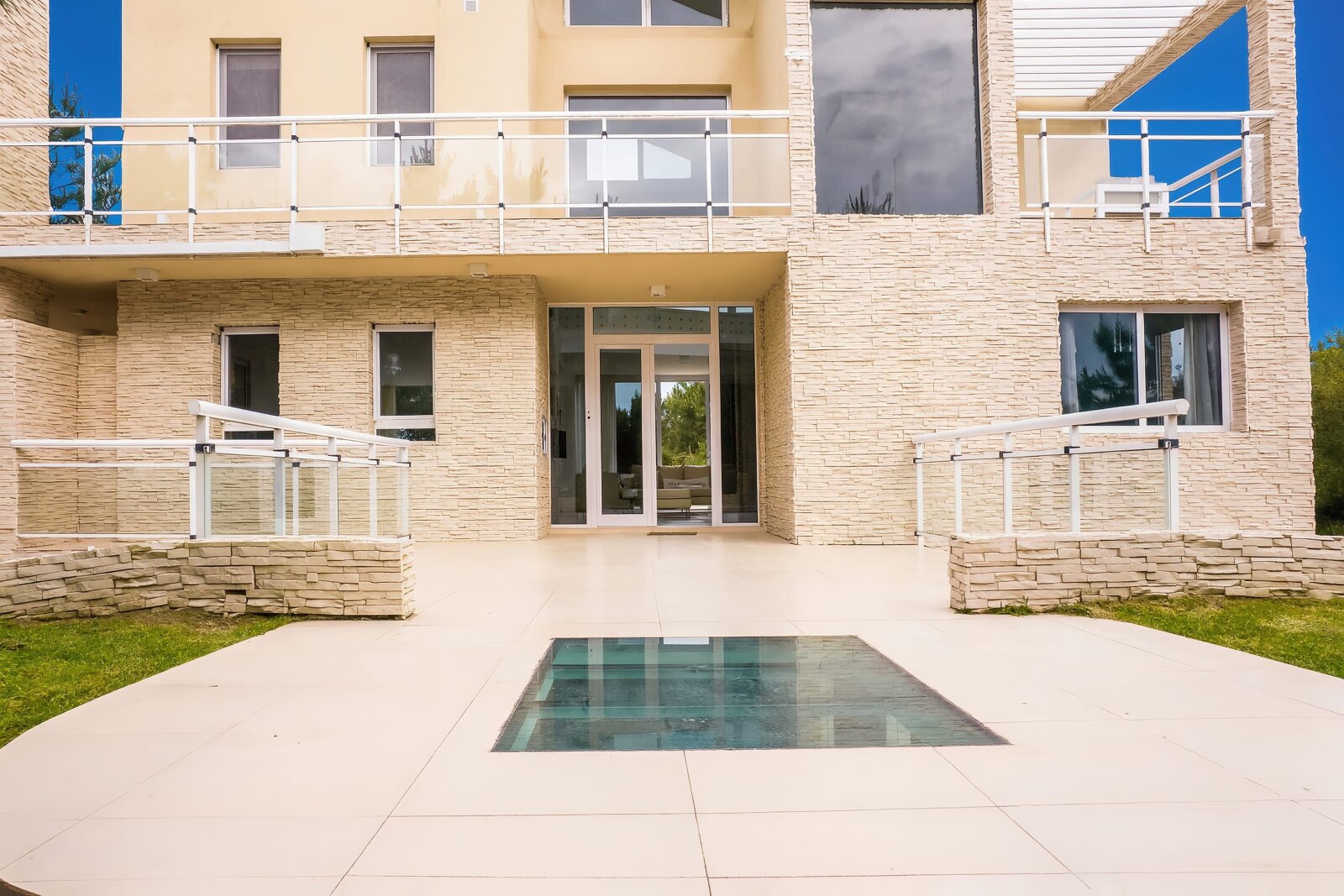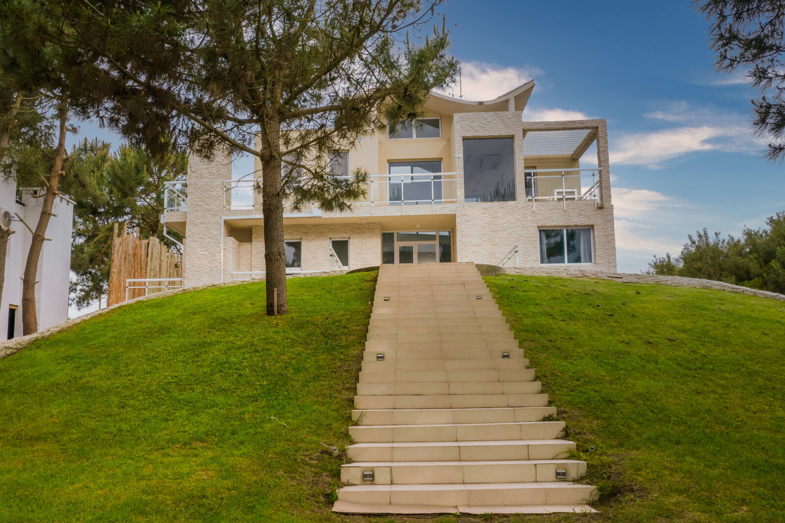 La propiedad se desarrolla en tres niveles con grandes ventanales que integran luz natural y vistas al mar y al bosque. La combinación de piedra, líneas modernas y materiales nobles refuerzan la solidez y elegancia de la construcción.