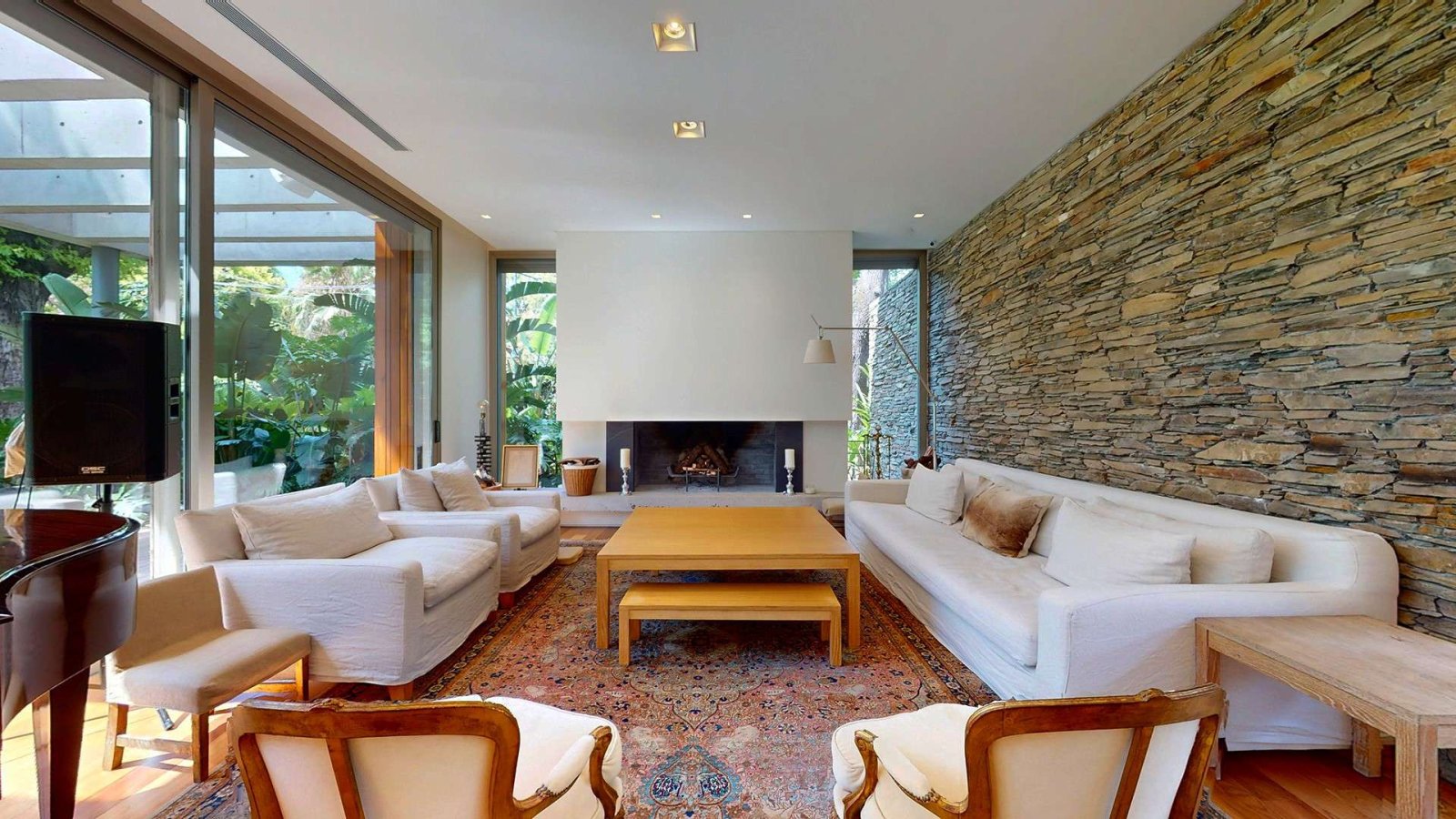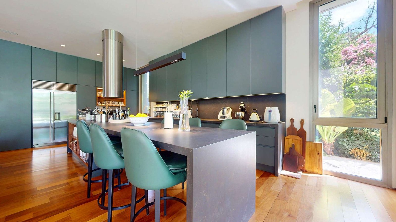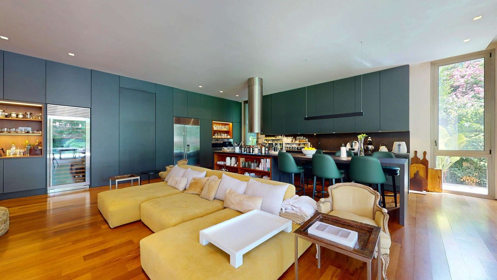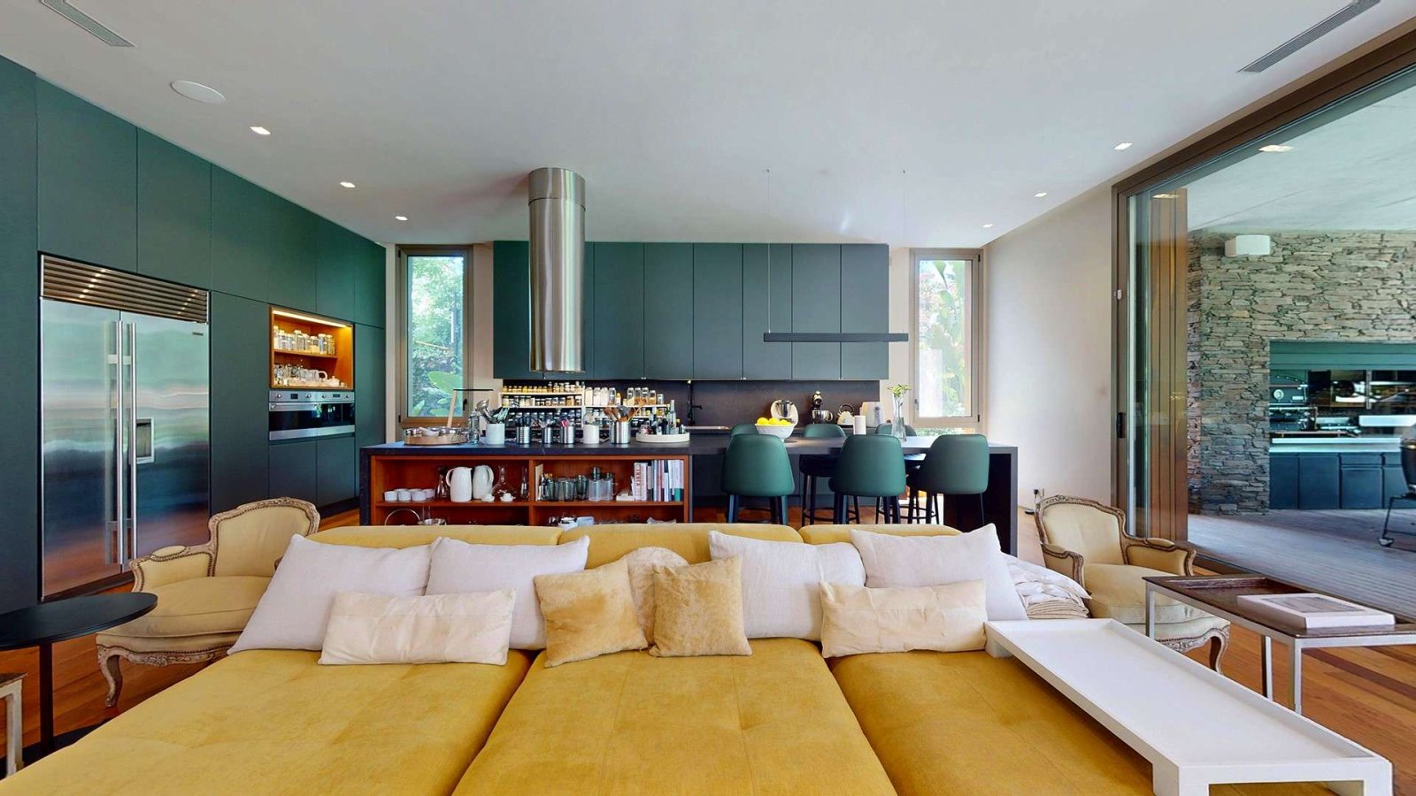 Desde su ingreso, la casa transmite una sensación de amplitud y luminosidad. El hall de recepción conduce a un gran living comedor con chimenea, pisos de madera y amplios ventanales de piso a techo que integran el interior con el jardín. La cocina, de diseño moderno y equipamiento premium, se presenta como uno de los espacios centrales de la casa: isla de grandes dimensiones, muebles a medida, cocina industrial, dos hornos eléctricos, cafetera empotrada y cava, pensada tanto para el uso diario como para recibir invitados.