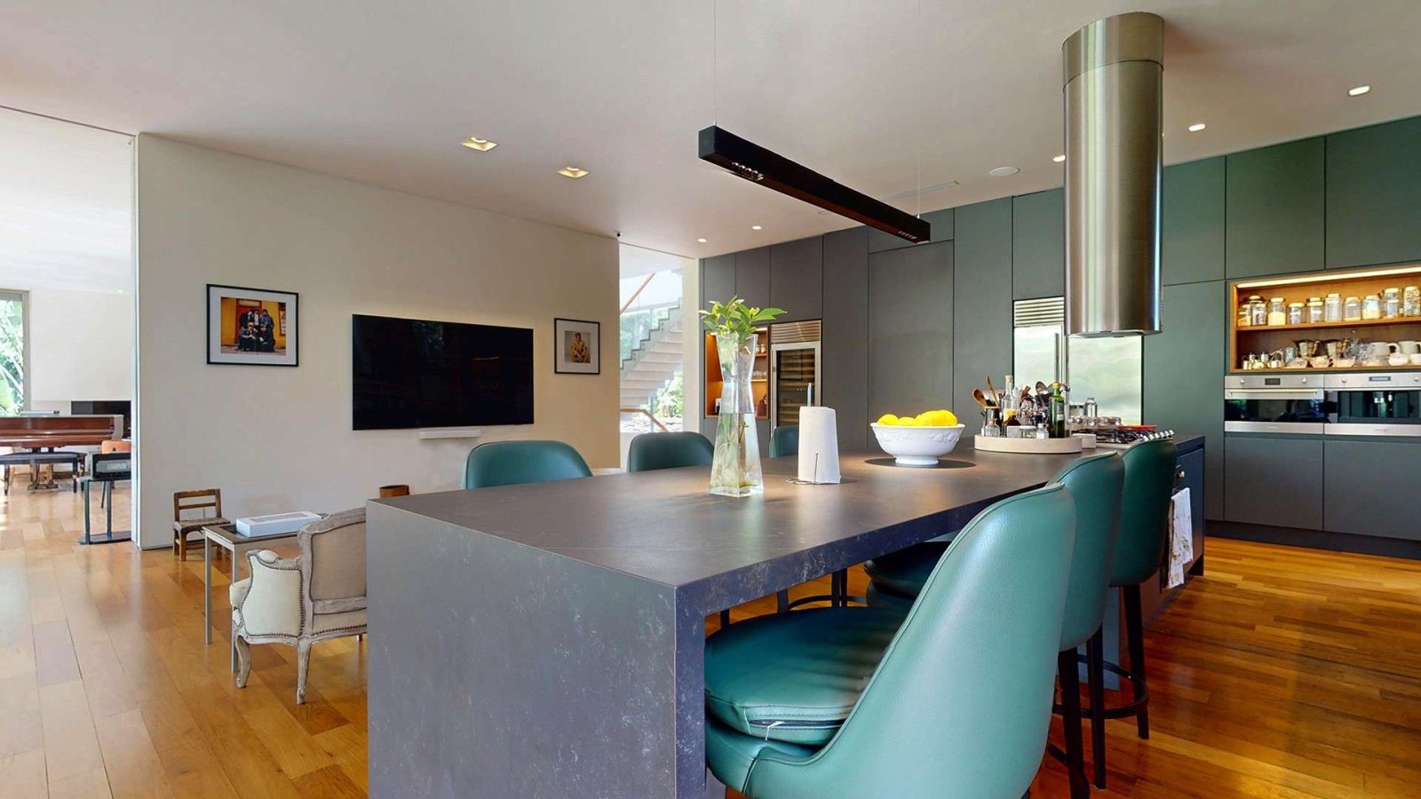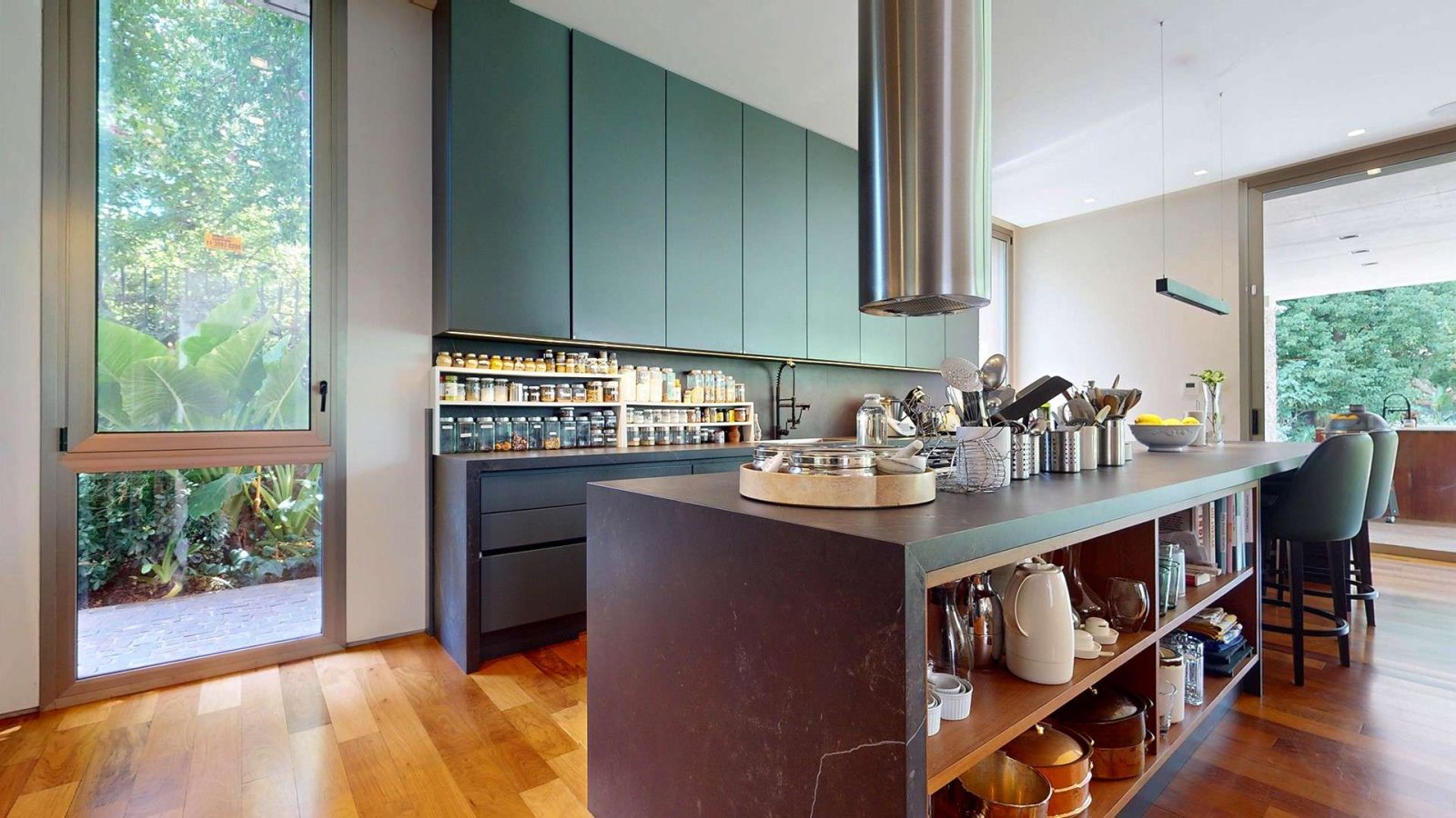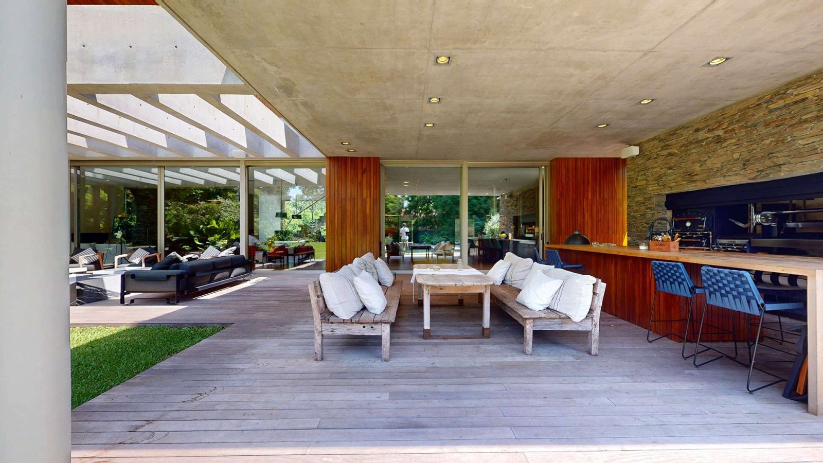 Desde su ingreso, la casa transmite una sensación de amplitud y luminosidad. El hall de recepción conduce a un gran living comedor con chimenea, pisos de madera y amplios ventanales de piso a techo que integran el interior con el jardín. La cocina, de diseño moderno y equipamiento premium, se presenta como uno de los espacios centrales de la casa: isla de grandes dimensiones, muebles a medida, cocina industrial, dos hornos eléctricos, cafetera empotrada y cava, pensada tanto para el uso diario como para recibir invitados.