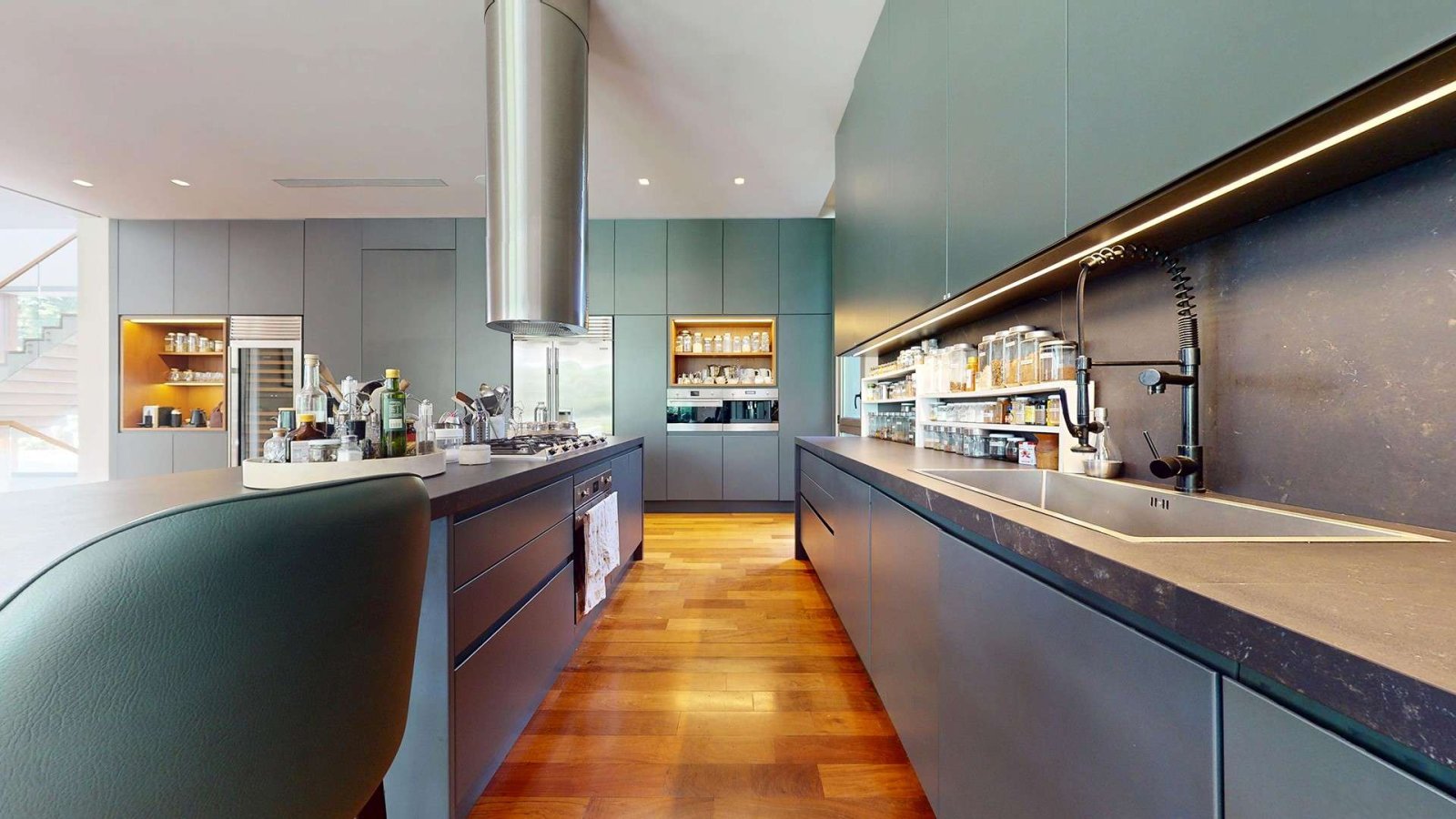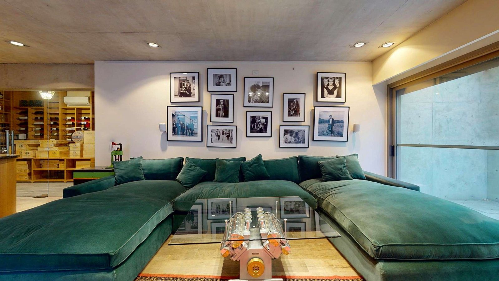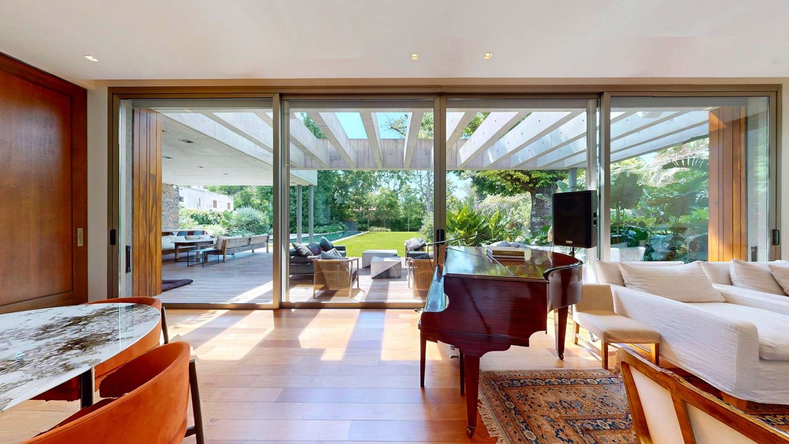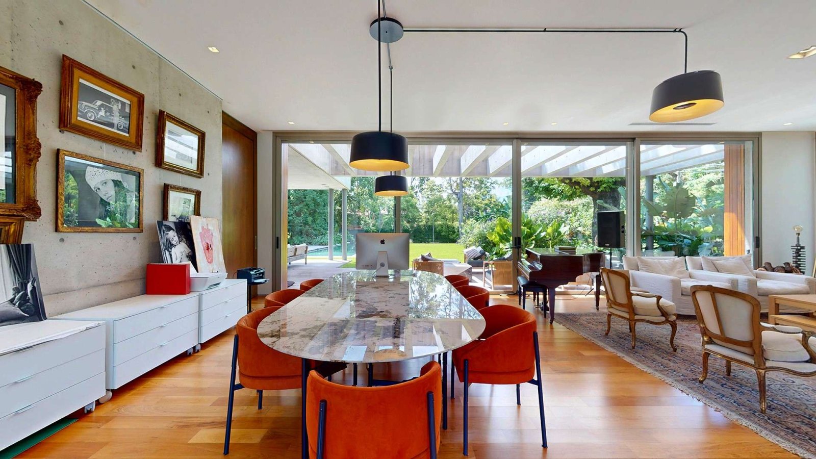 Desde su ingreso, la casa transmite una sensación de amplitud y luminosidad. El hall de recepción conduce a un gran living comedor con chimenea, pisos de madera y amplios ventanales de piso a techo que integran el interior con el jardín. La cocina, de diseño moderno y equipamiento premium, se presenta como uno de los espacios centrales de la casa: isla de grandes dimensiones, muebles a medida, cocina industrial, dos hornos eléctricos, cafetera empotrada y cava, pensada tanto para el uso diario como para recibir invitados.