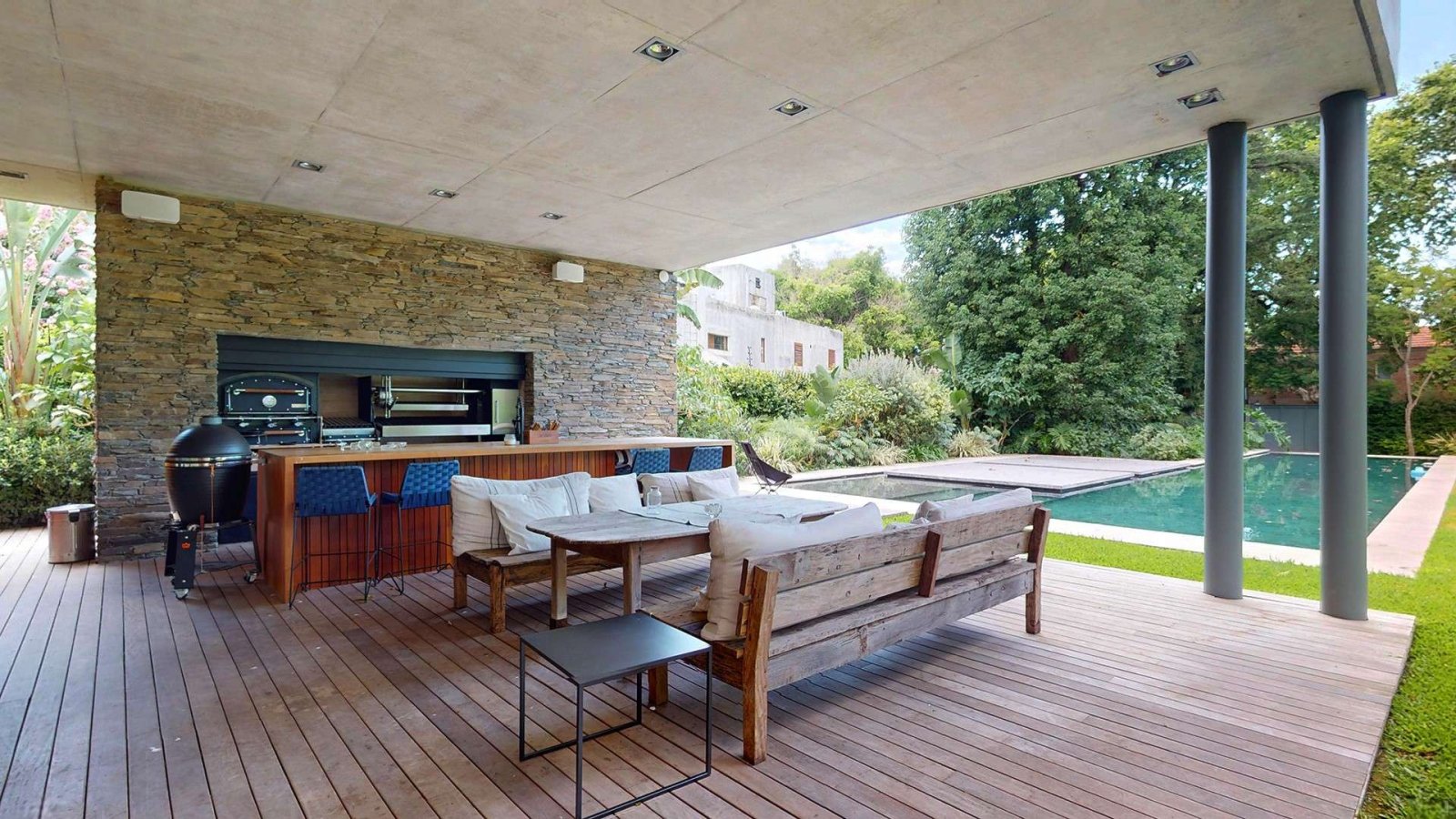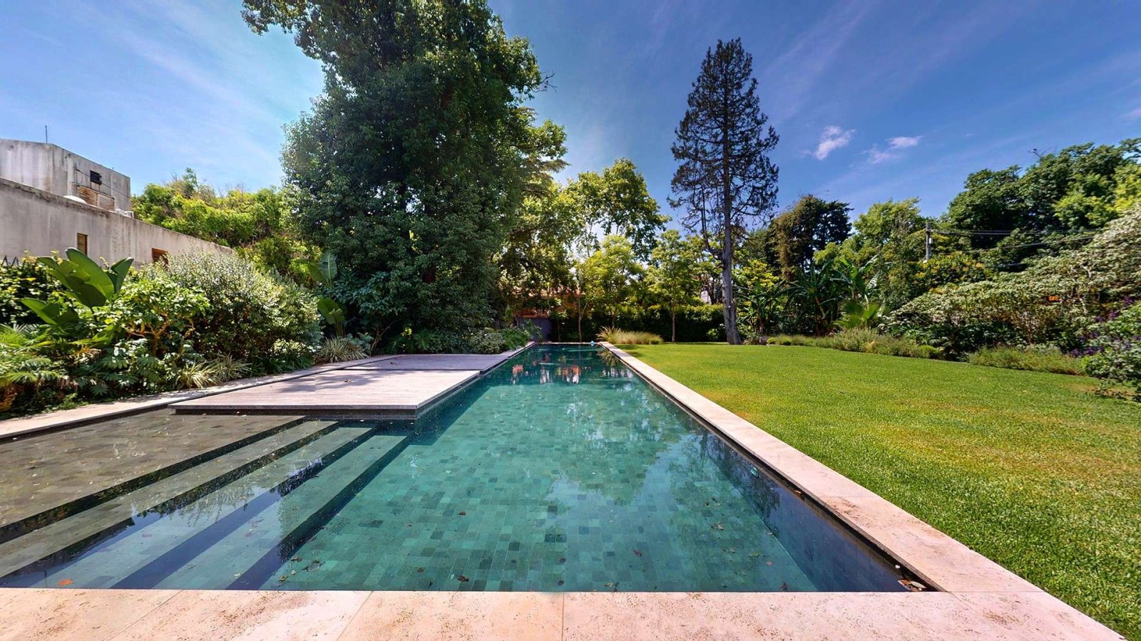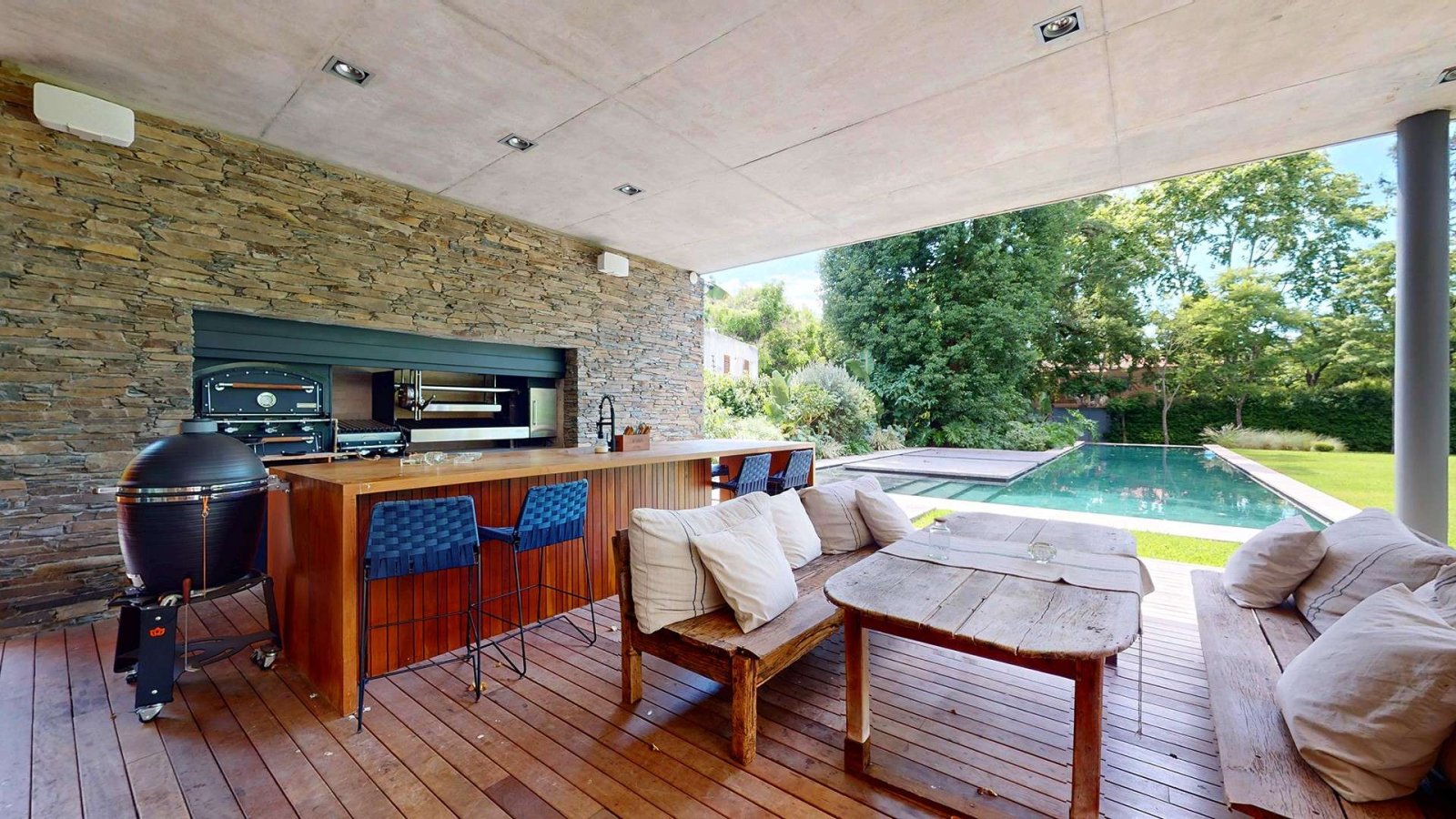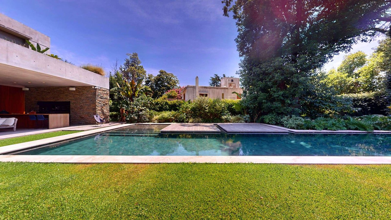 El exterior es uno de los grandes protagonistas de la casa: jardín parquizado con iluminación por sensores y riego por aspersión sectorizado, amplia galería con pisos de madera, gran mesada con bacha, parrilla de acero inoxidable, horno y parrilla eléctricos, living exterior, huerta por goteo y sector de tender. La piscina, de generosas dimensiones, cuenta con borde infinito y un elegante deck integrado al espejo de agua.