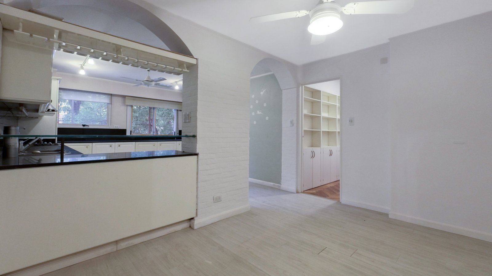 La cocina de 4,26 x 3,70 m² es amplia y funcional, y está acompañada por un comedor diario de 3,40 x 3,70 m², equipado con aire acondicionado y ventilador de techo. El hall de distribución incluye un práctico espacio de guardado de piso a techo.