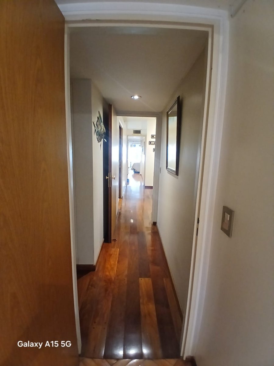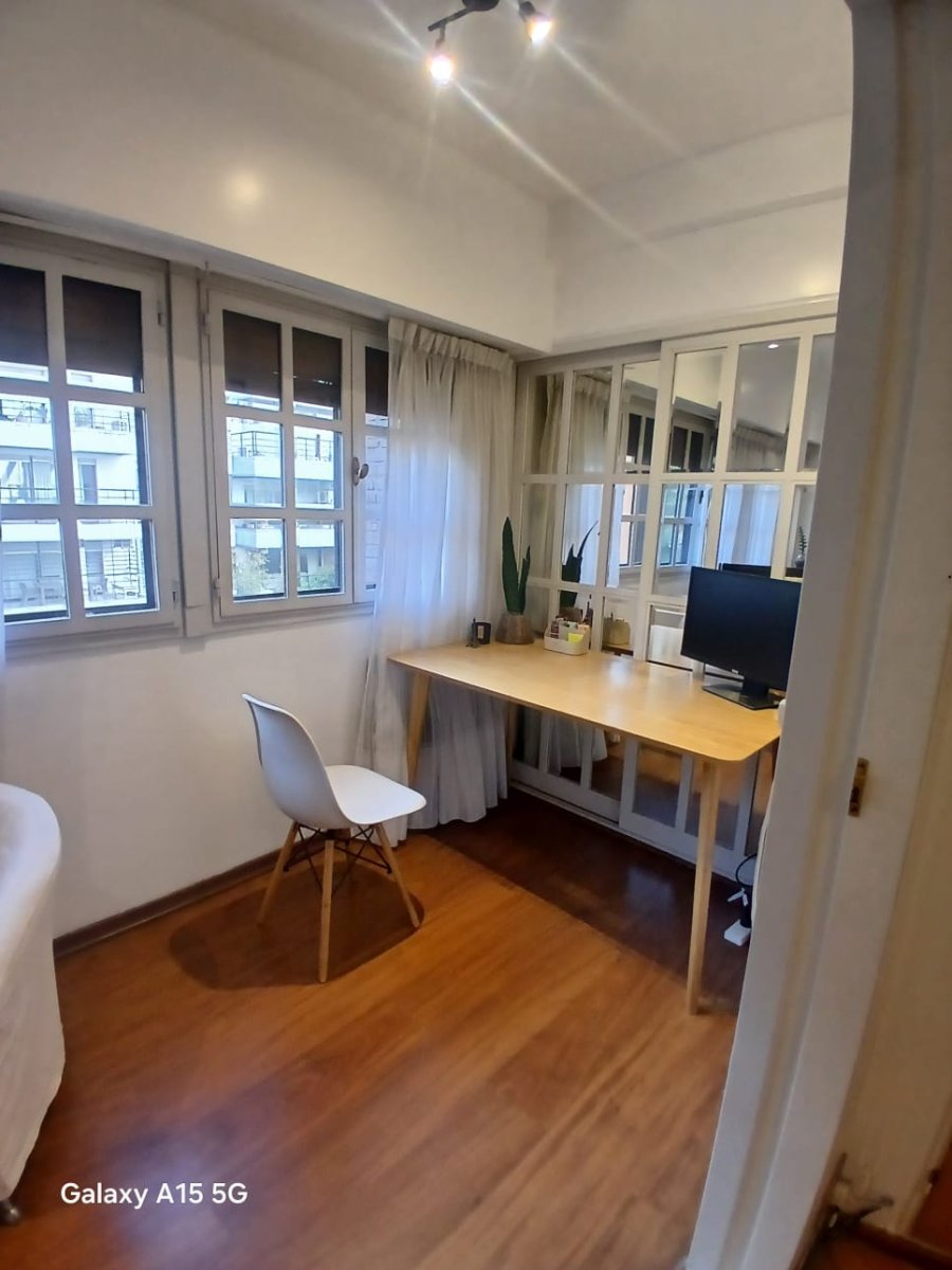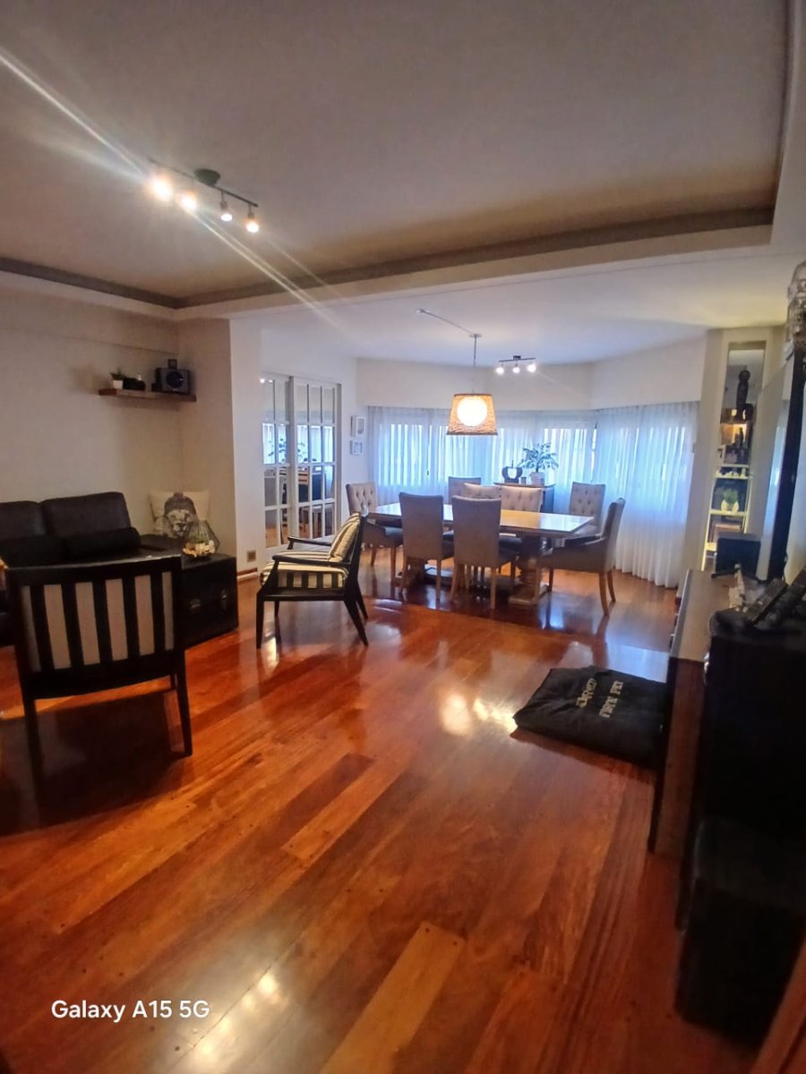 La propiedad cuenta con tres amplios dormitorios en suite, todos con excelente luz natural y generosos placares. Además, dispone de un escritorio independiente, ideal para home office o espacio de estudio. El área social se compone de un elegante living-comedor con pisos de parquet y salida a balcón con vista abierta al pulmón de manzana, lo que asegura silencio y luminosidad.