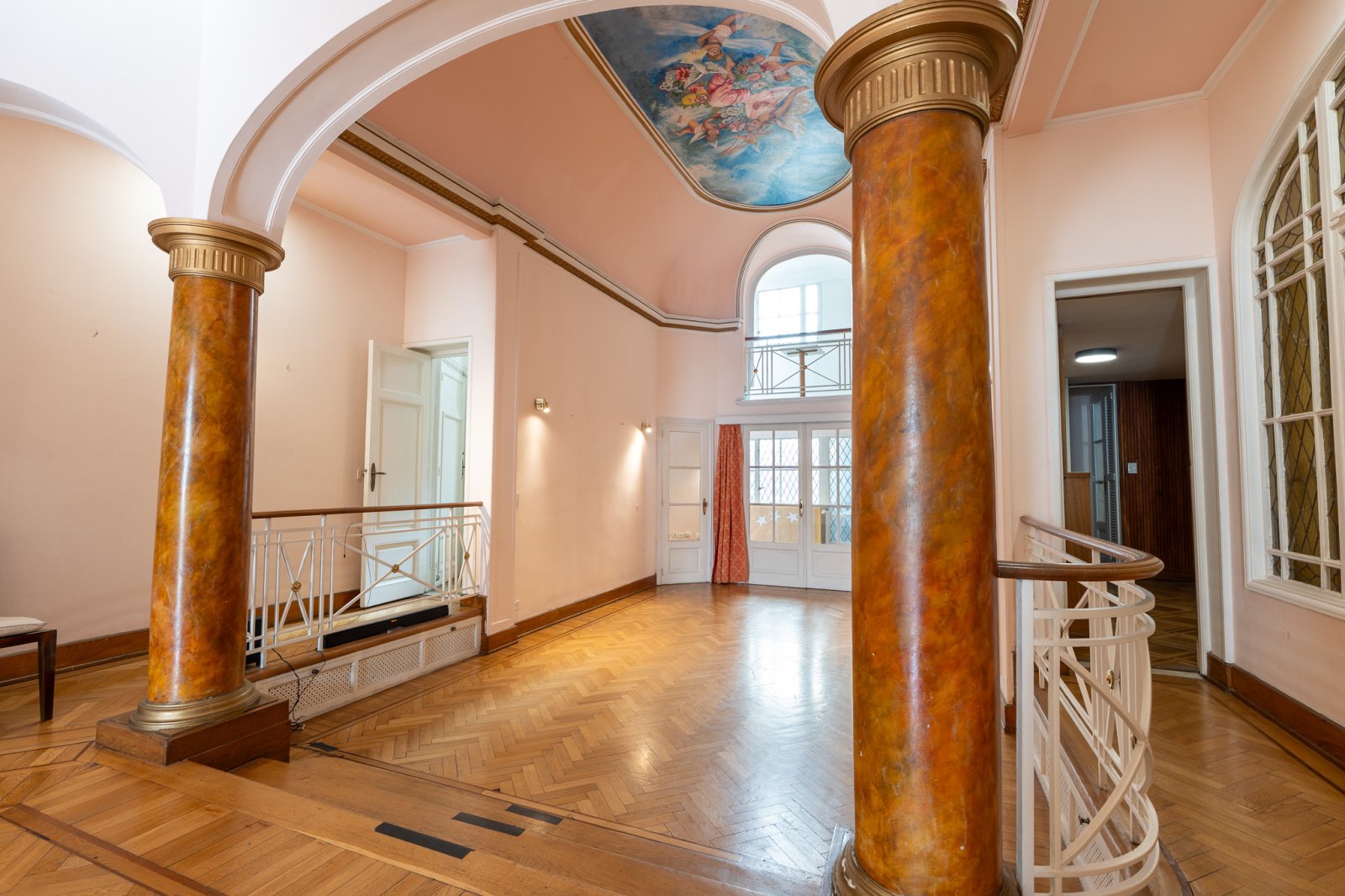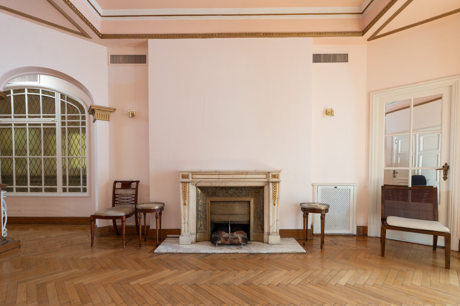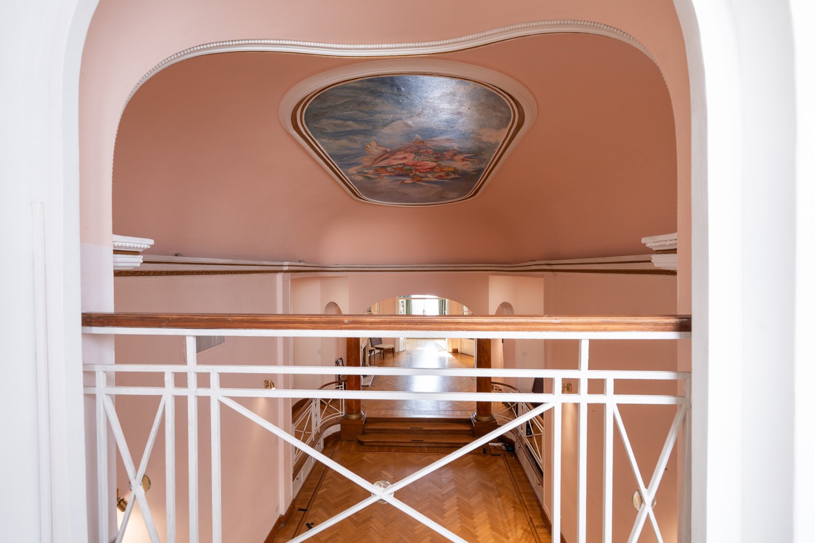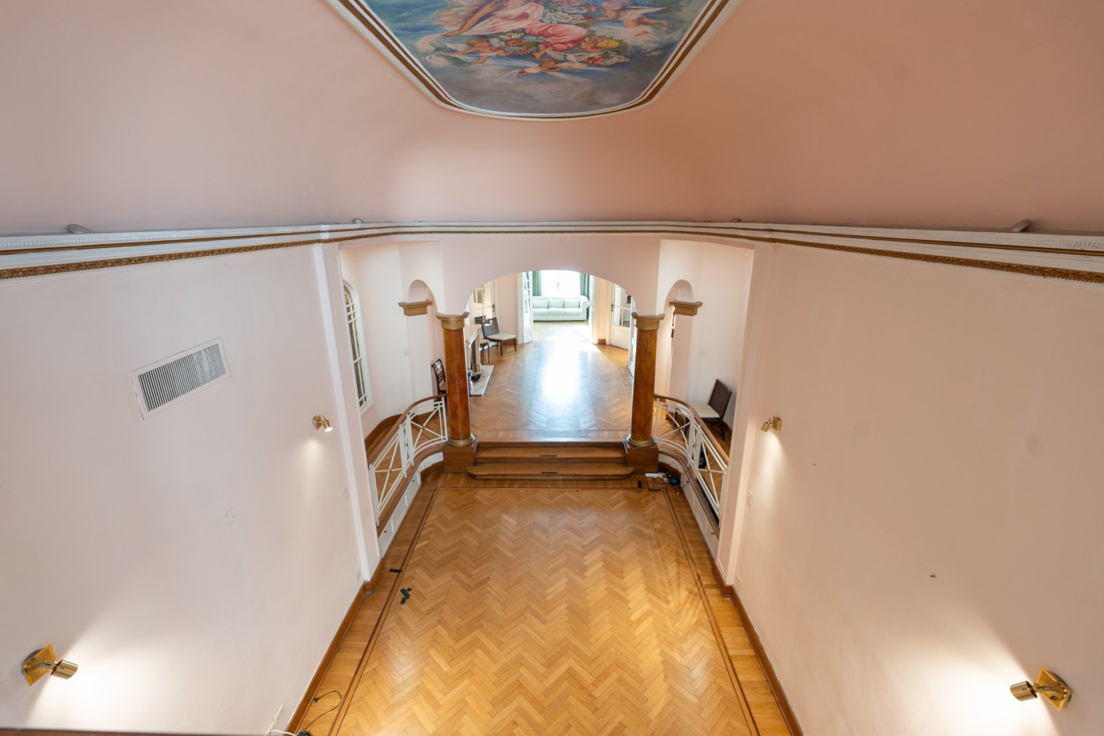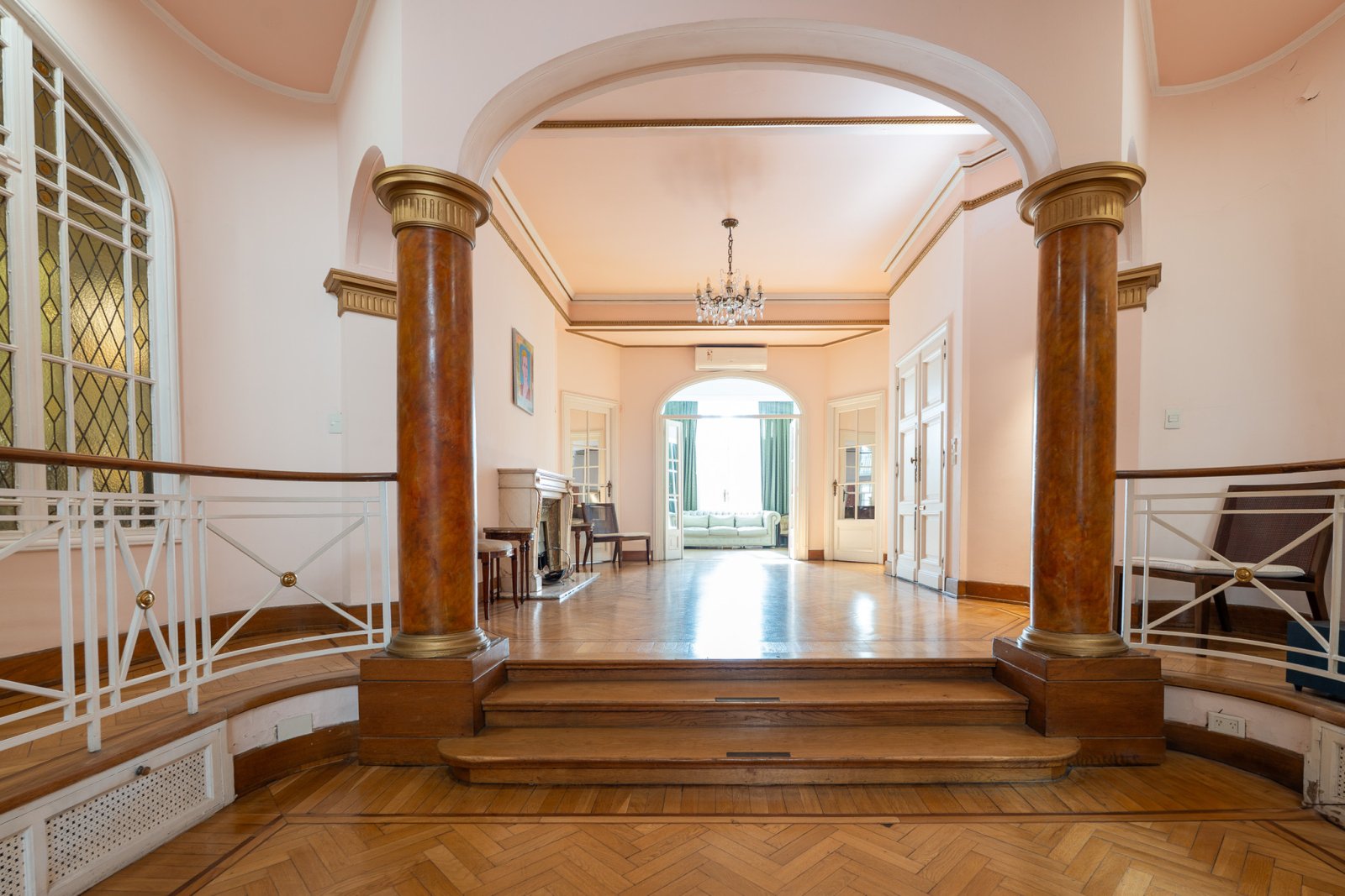 Un imponente living de 75 m² con techos en doble altura, columnas decorativas, molduras artesanales y un mural pintado a mano constituye el gran protagonista del hogar.