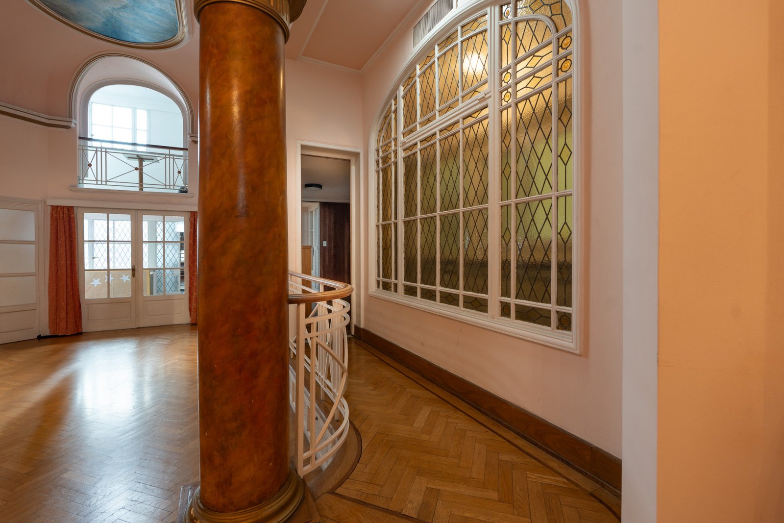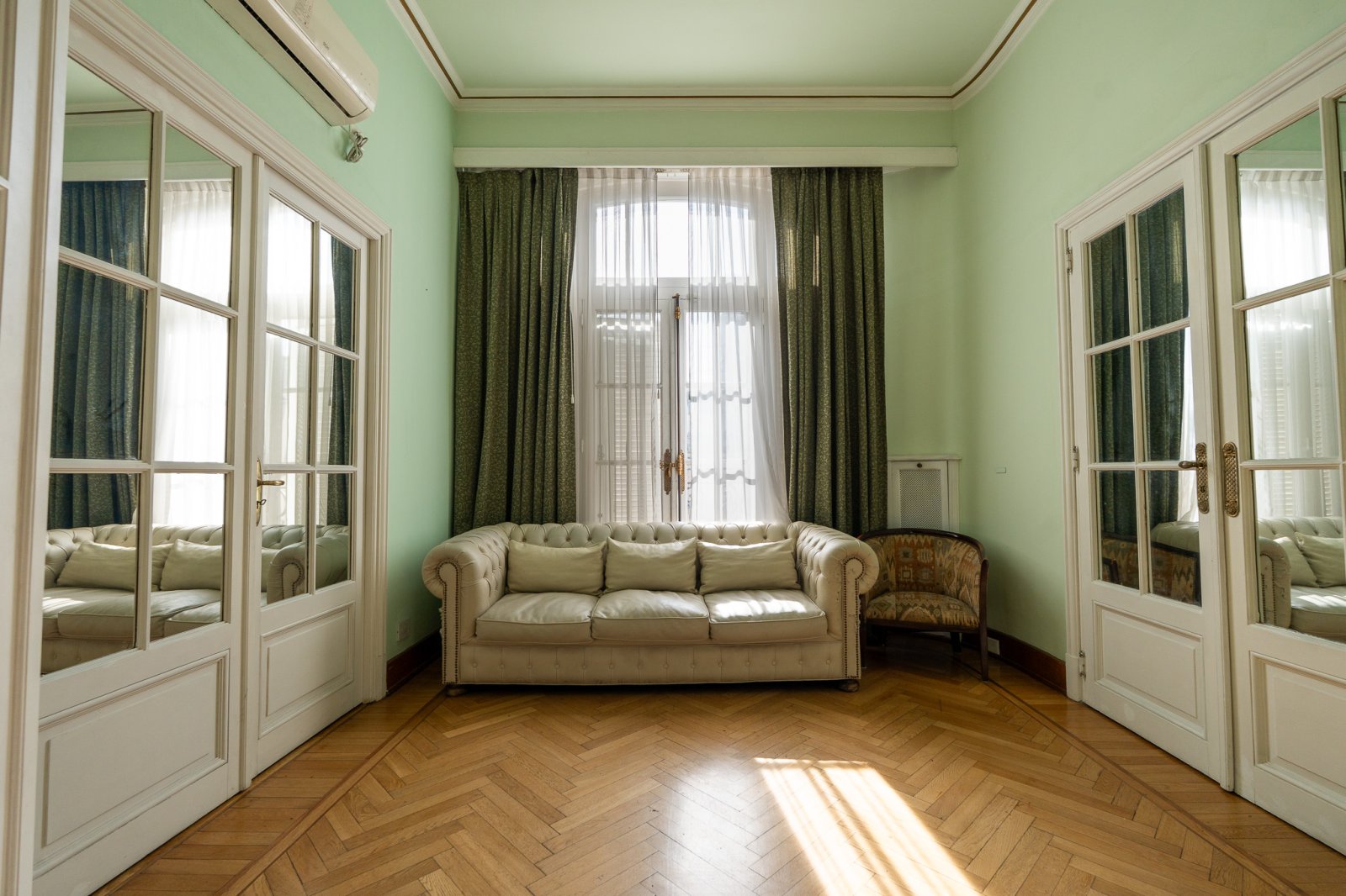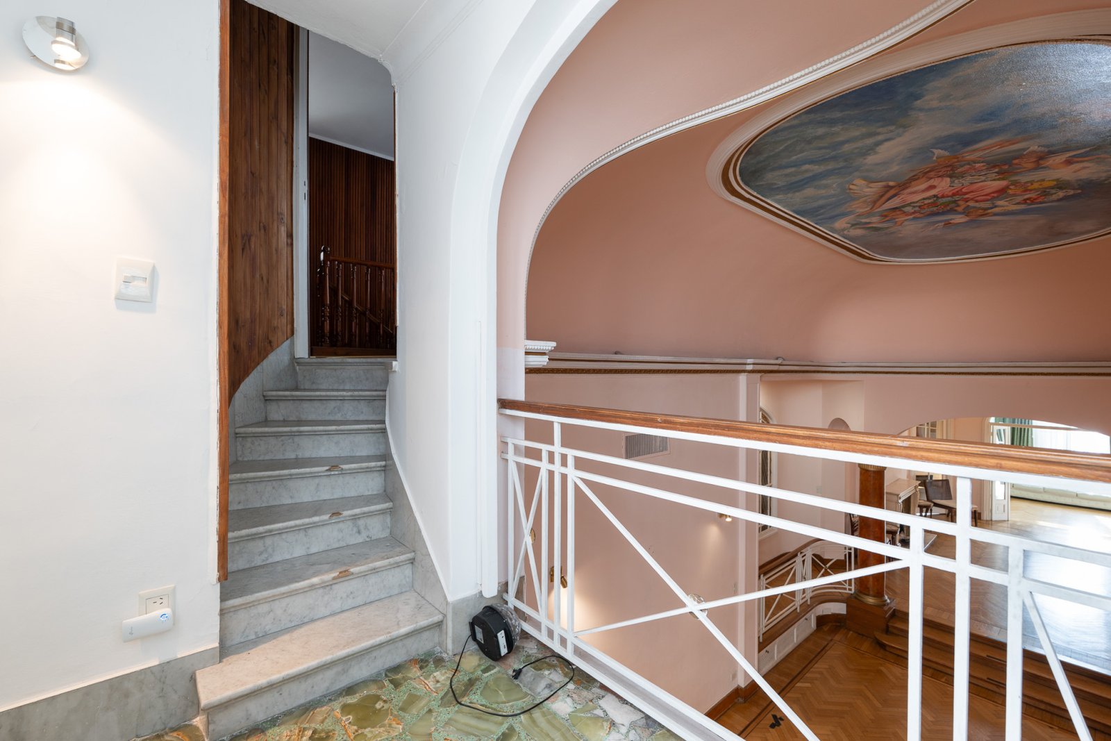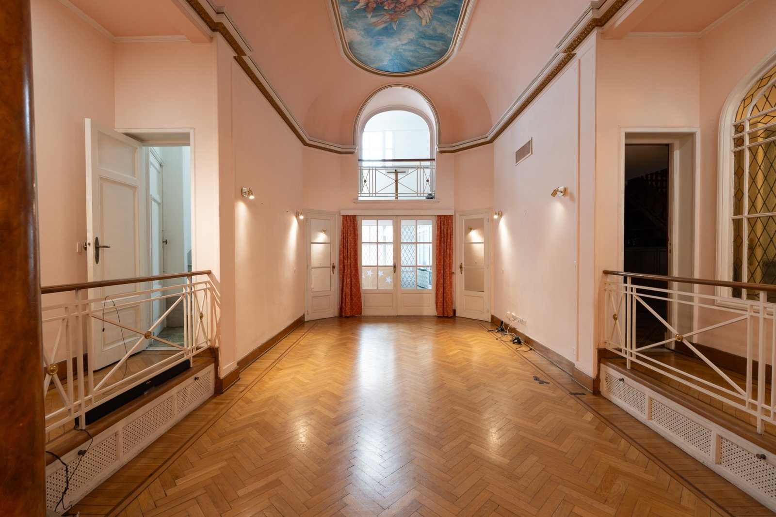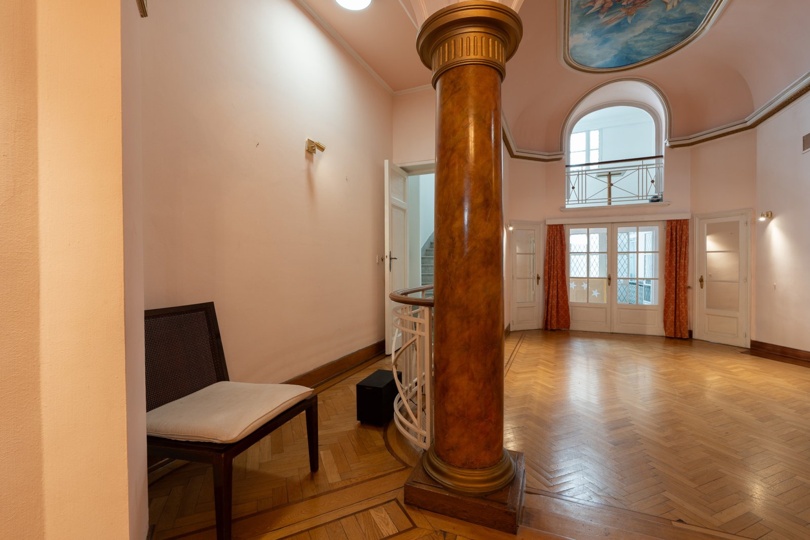 Un imponente living de 75 m² con techos en doble altura, columnas decorativas, molduras artesanales y un mural pintado a mano constituye el gran protagonista del hogar.