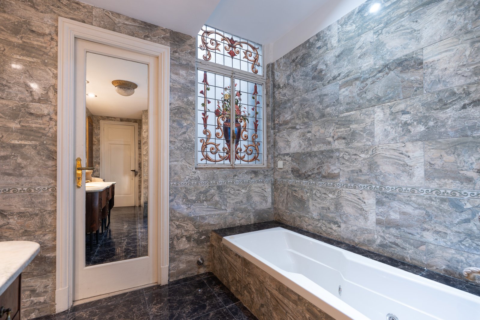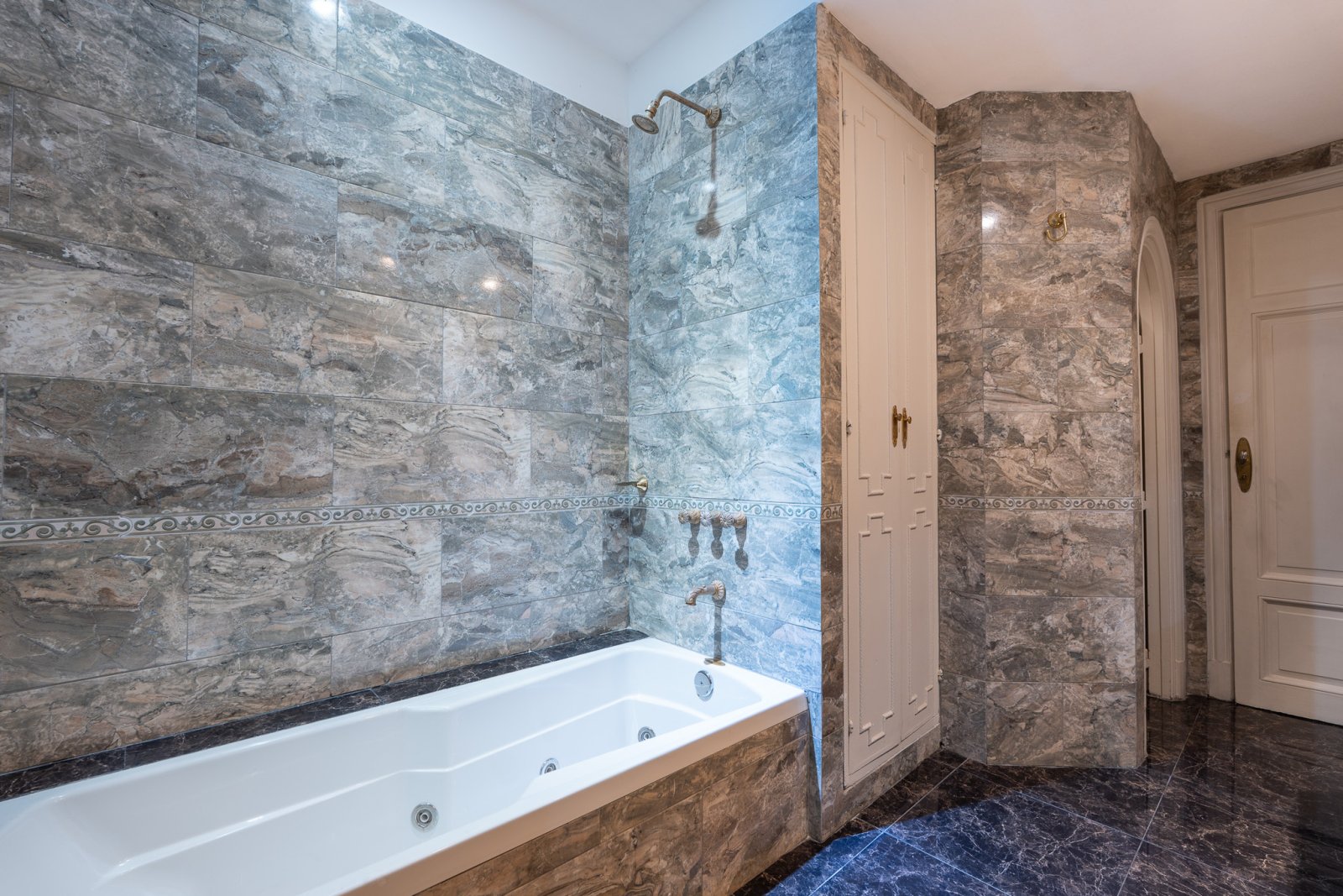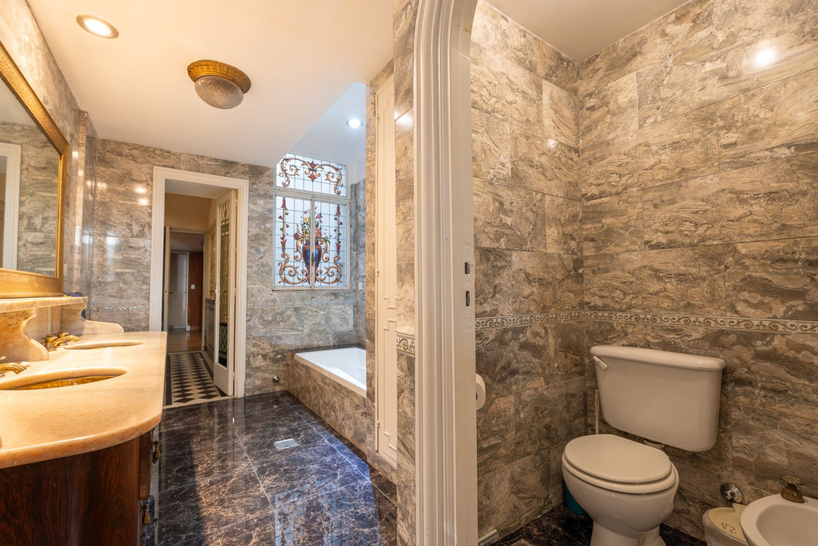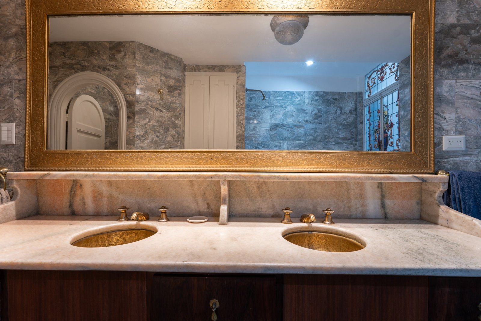 Baño principal de categoría, revestido en mármol, con doble bacha y bañera.