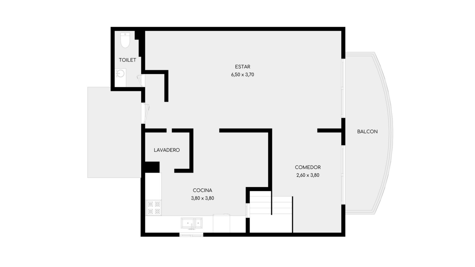 El ingreso conduce a un luminoso ambiente principal con living y comedor, con salida al balcón que aporta aire y luz natural. La planta social se completa con un toilette de recepción, ideal para invitados, y una cocina integrada de líneas modernas, pensada para un uso cómodo y cotidiano.
