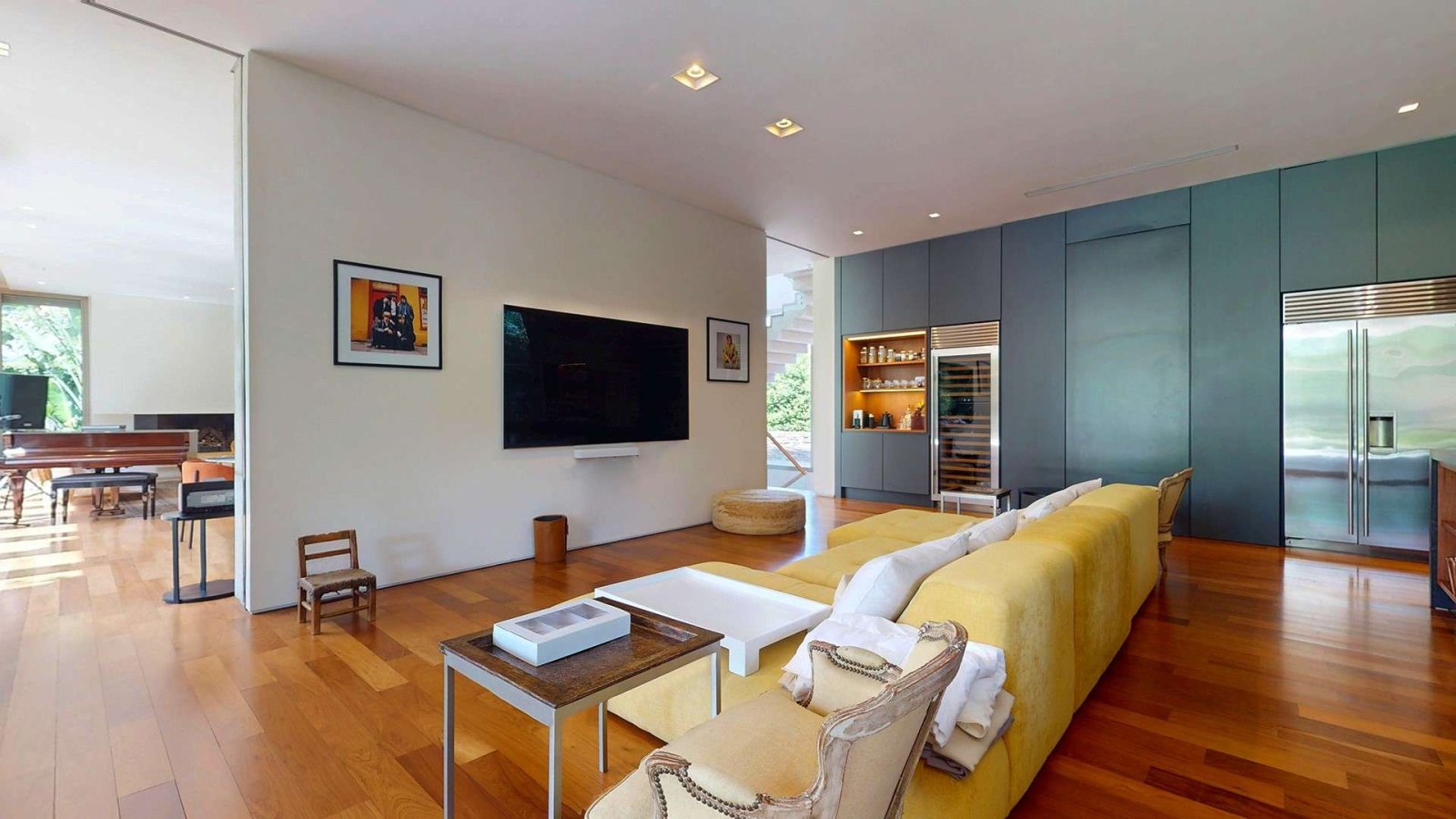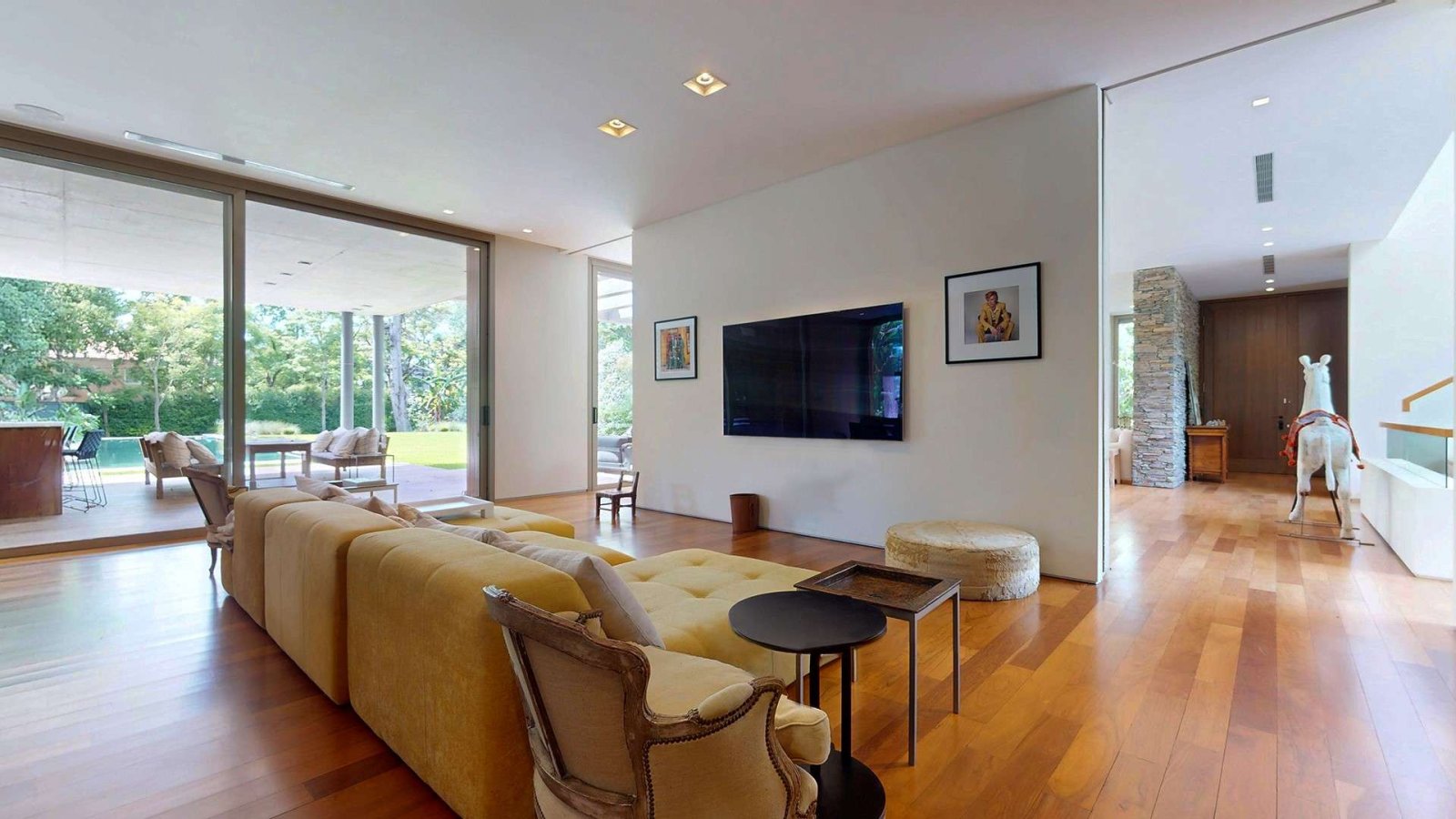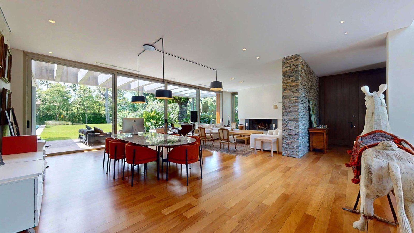 Desde su ingreso, la casa transmite una sensación de amplitud y luminosidad. El hall de recepción conduce a un gran living comedor con chimenea, pisos de madera y amplios ventanales de piso a techo que integran el interior con el jardín. La cocina, de diseño moderno y equipamiento premium, se presenta como uno de los espacios centrales de la casa: isla de grandes dimensiones, muebles a medida, cocina industrial, dos hornos eléctricos, cafetera empotrada y cava, pensada tanto para el uso diario como para recibir invitados.