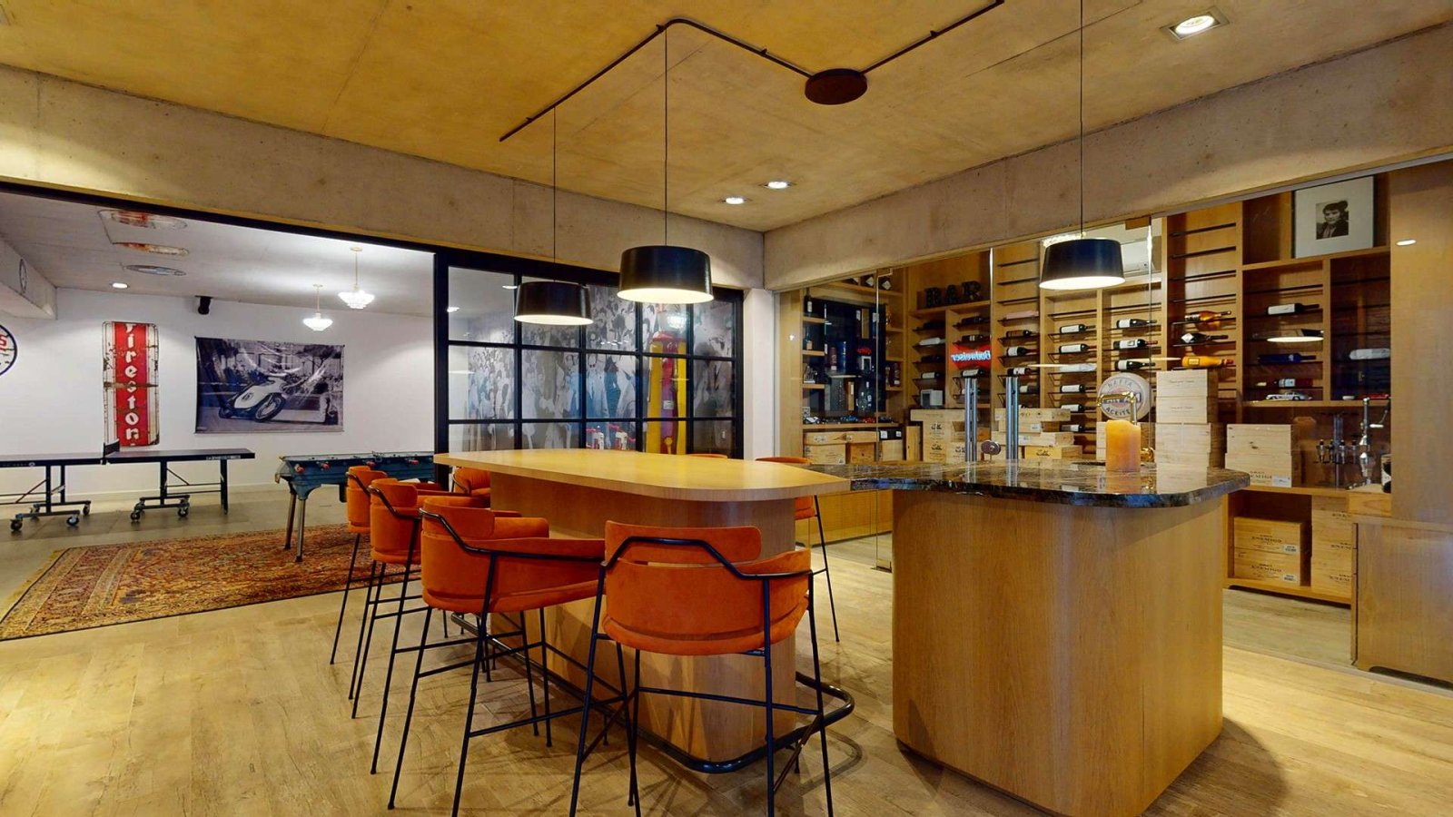 El subsuelo alberga un espectacular playroom con gran barra y bodega, conectado directamente al garage con capacidad para cinco autos, generando un espacio versátil pensado para reuniones, entretenimiento o sala de juegos. Toilette de cortesía.