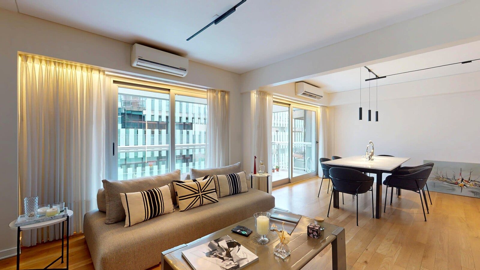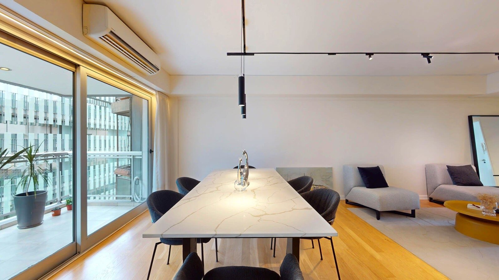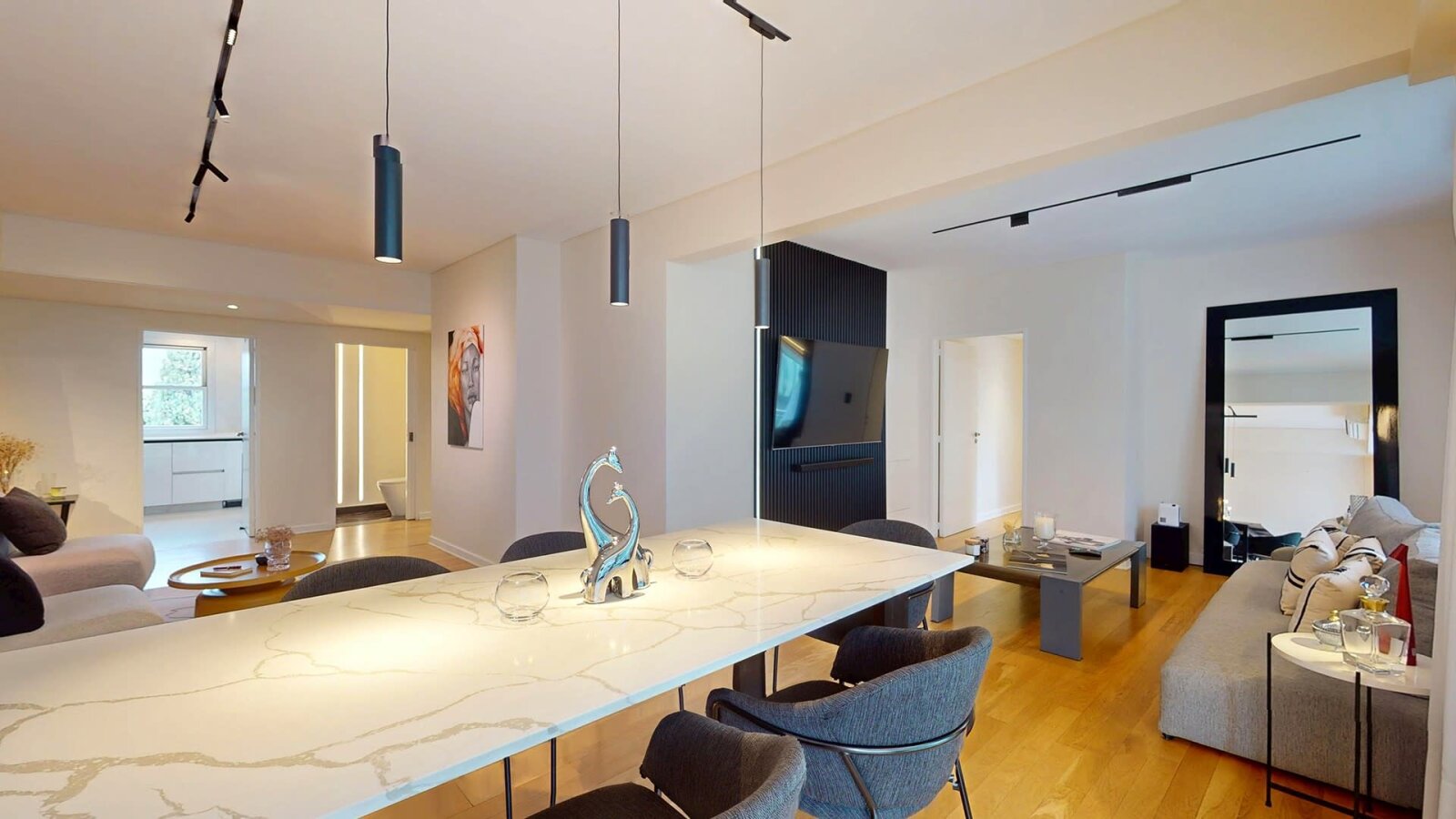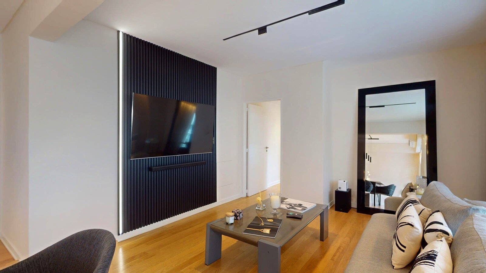 El departamento cuenta con un living comedor de generosas dimensiones, integrado a un TV room que puede adaptarse fácilmente como tercer dormitorio o escritorio, aportando gran versatilidad.