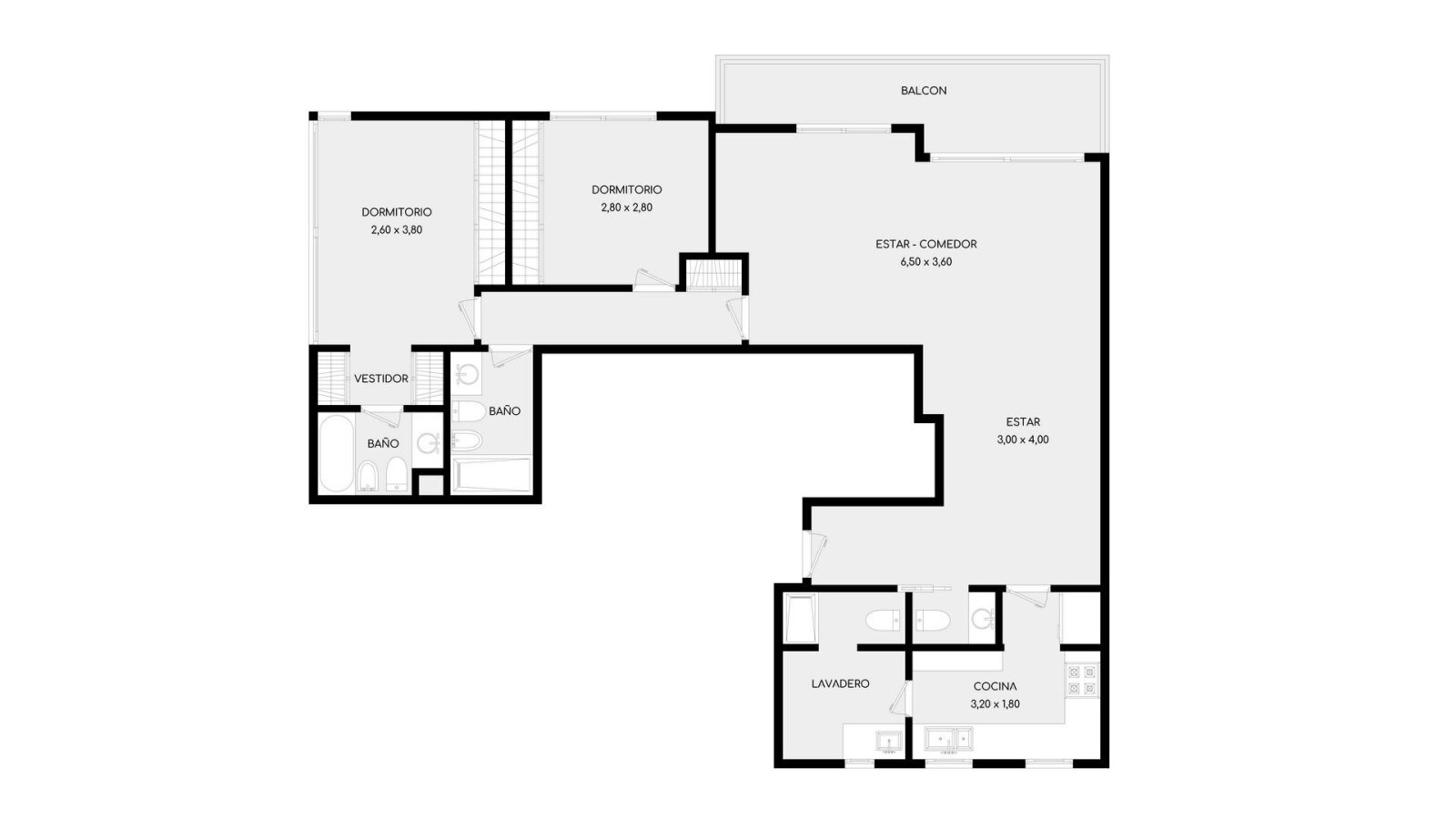 Dispone de dos dormitorios, siendo el principal en suite, más un segundo baño completo y toilette de recepción.