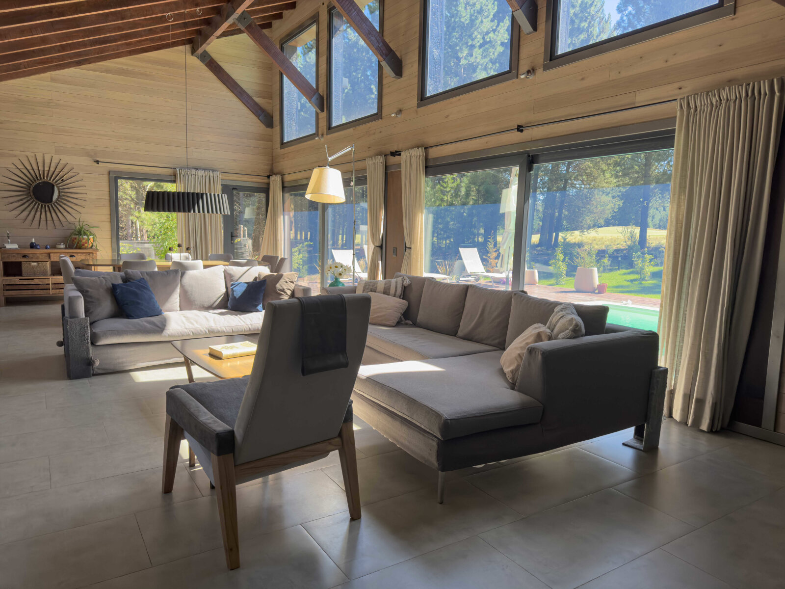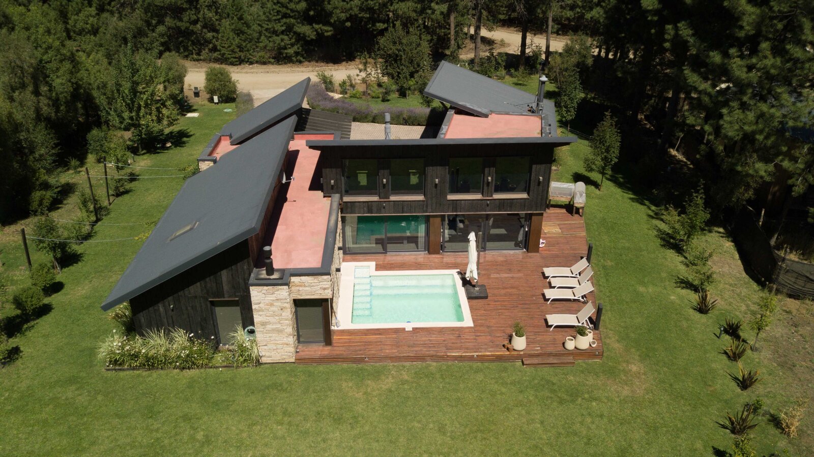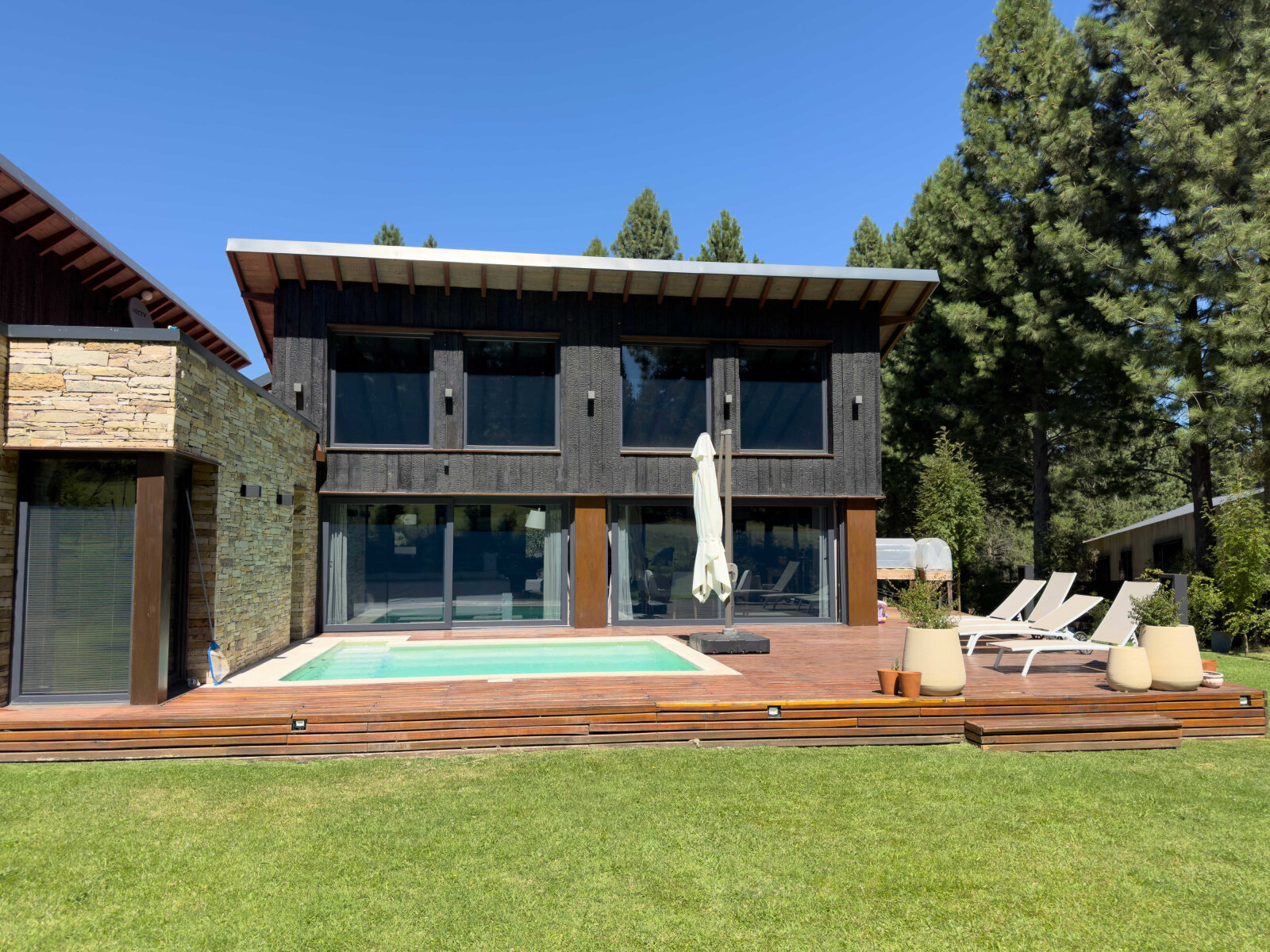 En el exterior, un deck aterrazado de madera se proyecta hacia la piscina climatizada, rodeada de un jardín parquizado con riego automatizado e iluminación escenográfica, generando un ambiente ideal para el relax y el entretenimiento.