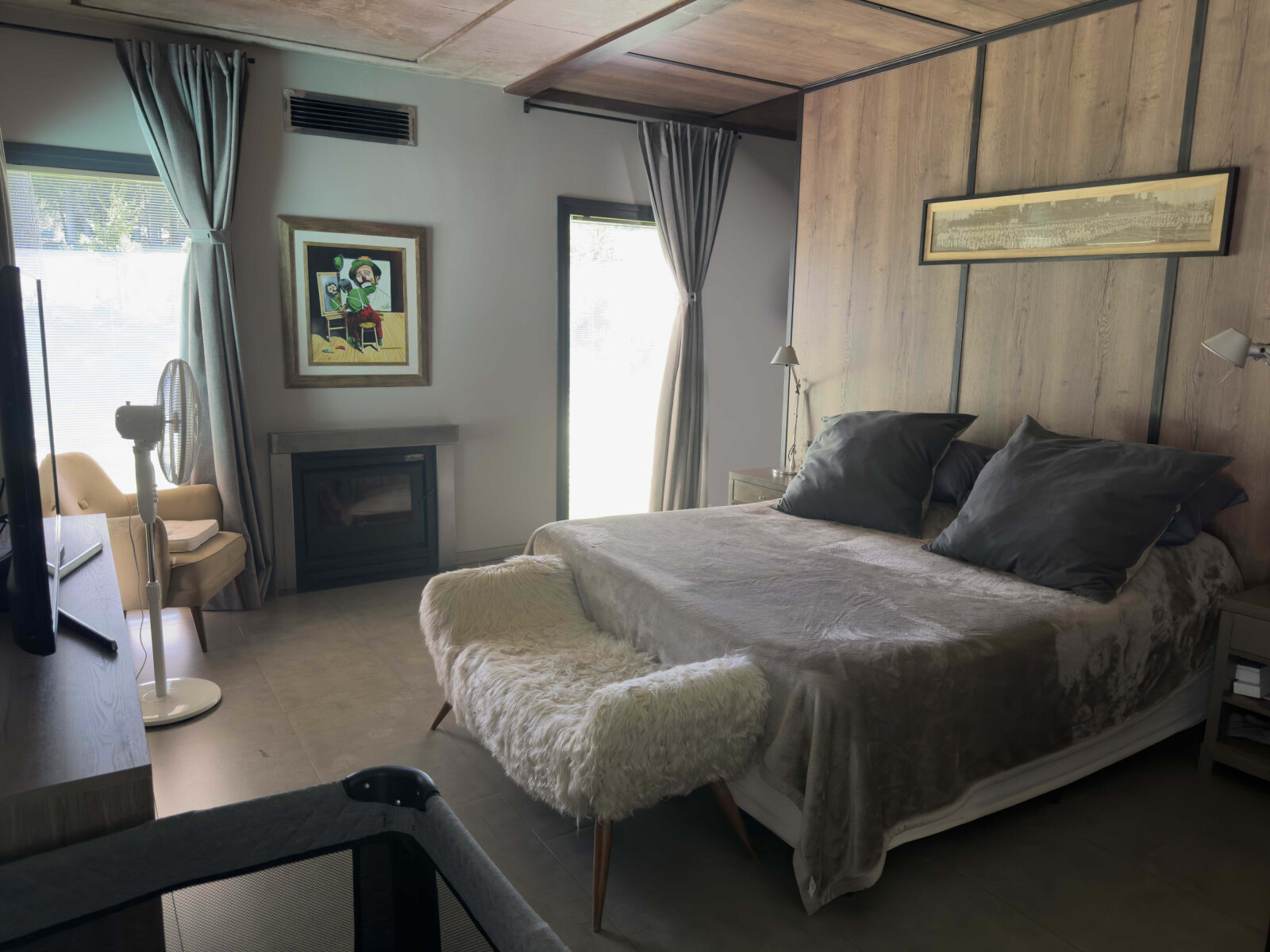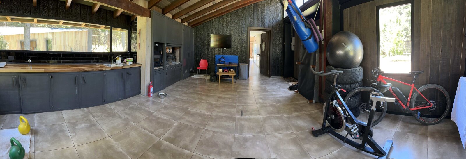 El garage cubierto para dos vehículos, con portón levadizo, se integra como un espacio versátil que funciona también como quincho con parrilla y área de gimnasio.
