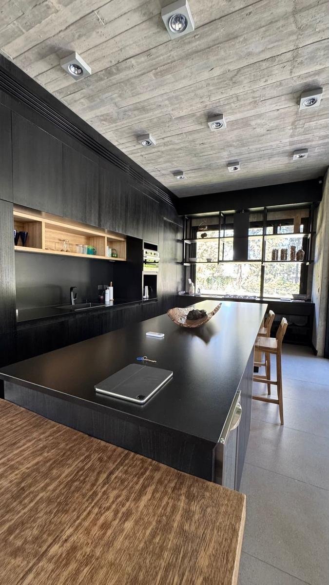 Casa de características modernas combinando dos materialidades bien definidas hormigón visto PB y símil madera en la PA color negro, cubierta de Chapa prepintada, aplicado en todo su interior con pulieretano expandido de 2cm.