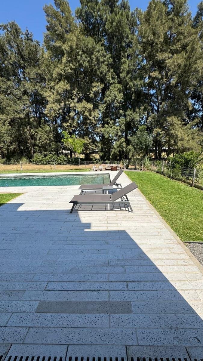 Cochera techada para 2 autos. Pileta con deck, solarium y fogonero.