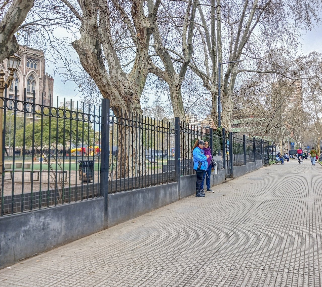 Frente a la plaza Emilio Mitre con juegos para niños y perros.