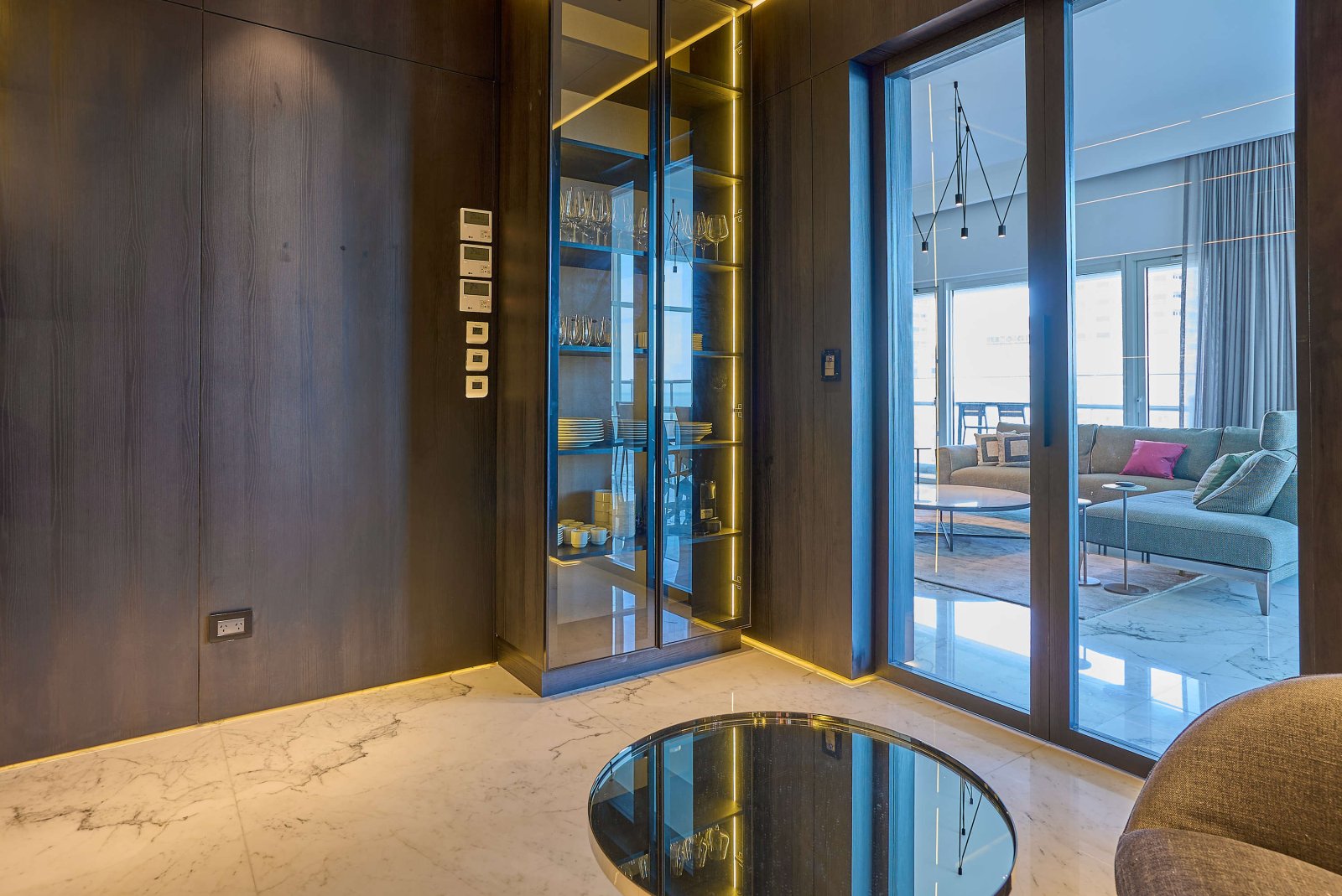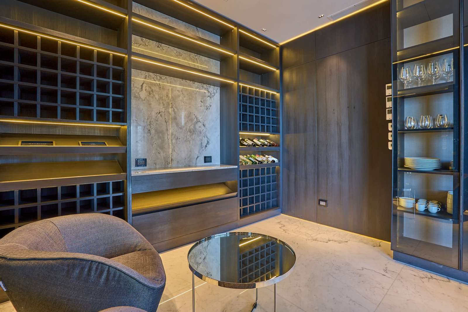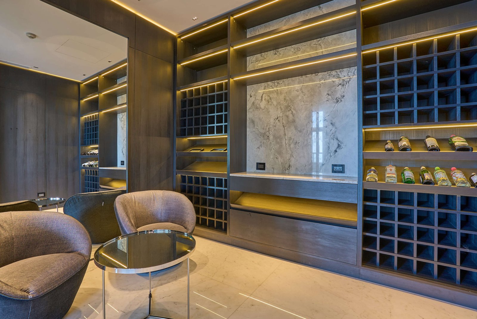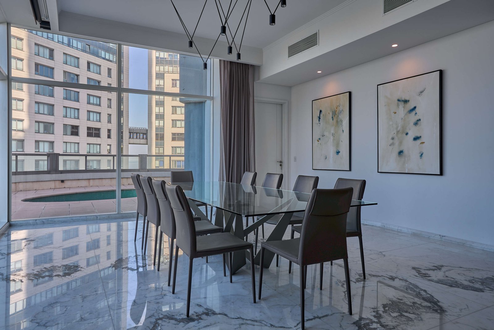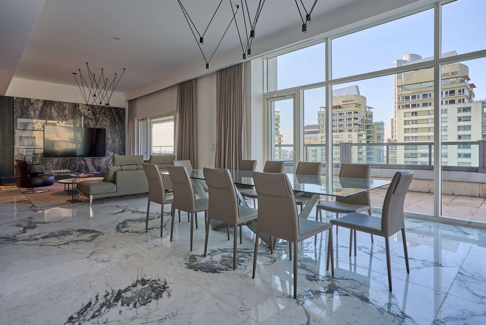 El acceso se realiza a través de un palier privado con ingreso por dos ascensores principales. Al ingresar, se destaca un imponente living comedor, acompañado por un sector especialmente destinado a cava de vinos. La terraza, verdaderamente protagonista, ofrece una piscina privada que invita a disfrutar de las vistas y del aire libre durante todo el año. La cocina es independiente, con comedor diario, y se complementa con un toilette de recepción.